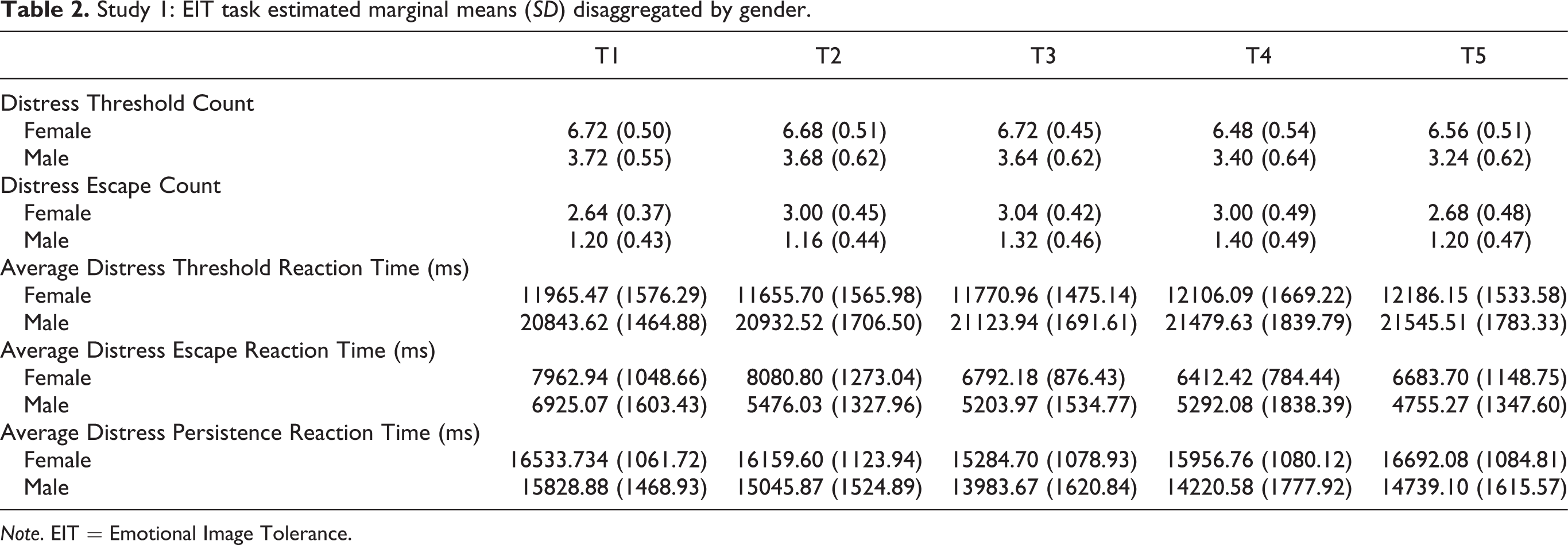 Associations between EIT task negative image variables, self-report distress tolerance, and other psychological constructs. To assess the validity of this task, we examined the correlations between the key EIT task variables calculated from scores on the negative images, with the self-report distress tolerance and the same psychological constructs assessed in Study 1 (Table 5). After controlling for gender, several of the EIT task variables were significantly correlated with self-report distress tolerance. Specifically, self-report distress tolerance was negatively correlated with the distress threshold count variable, such that individuals who reported a higher tolerance for distress on the Distress Tolerance Scale, indicated distress significantly less on negative images. Self-report distress tolerance was also negatively correlated with the Distress Escape Count variable, such that individuals who reported a higher tolerance for distress, escaped significantly fewer negative images than individuals with a lower self-reported distress tolerance. Further, self-report distress tolerance was positively associated with Distress Threshold reaction times, whereby individuals who reported a higher tolerance for distress, took longer to indicate distress on negative images. Additionally, the Distress Threshold reaction time variable was negatively associated with emotional reactivity, such that individuals who reported higher emotional reactivity were quicker to indicate distress on negative images than individuals who reported lower emotional reactivity. The Distress Threshold reaction time variables were also negatively associated with rumination, whereby individuals who reported higher levels of rumination indicated distress significantly more quickly than individuals who reported lower levels of rumination.