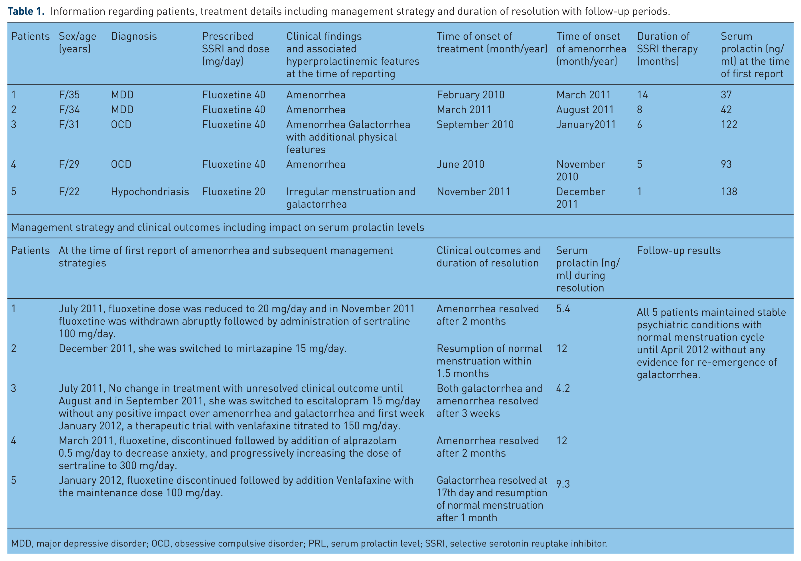 In all of the presented five cases, primary physical, biochemical examinations and negative pregnancy tests strongly suggest that their amenorrhea were temporally associated with fluoxetine trials. Further, in all cases the associated undesirable neuroendocrine clinical symptoms were accompanied by various degrees of elevated serum prolactin levels (Table 1).