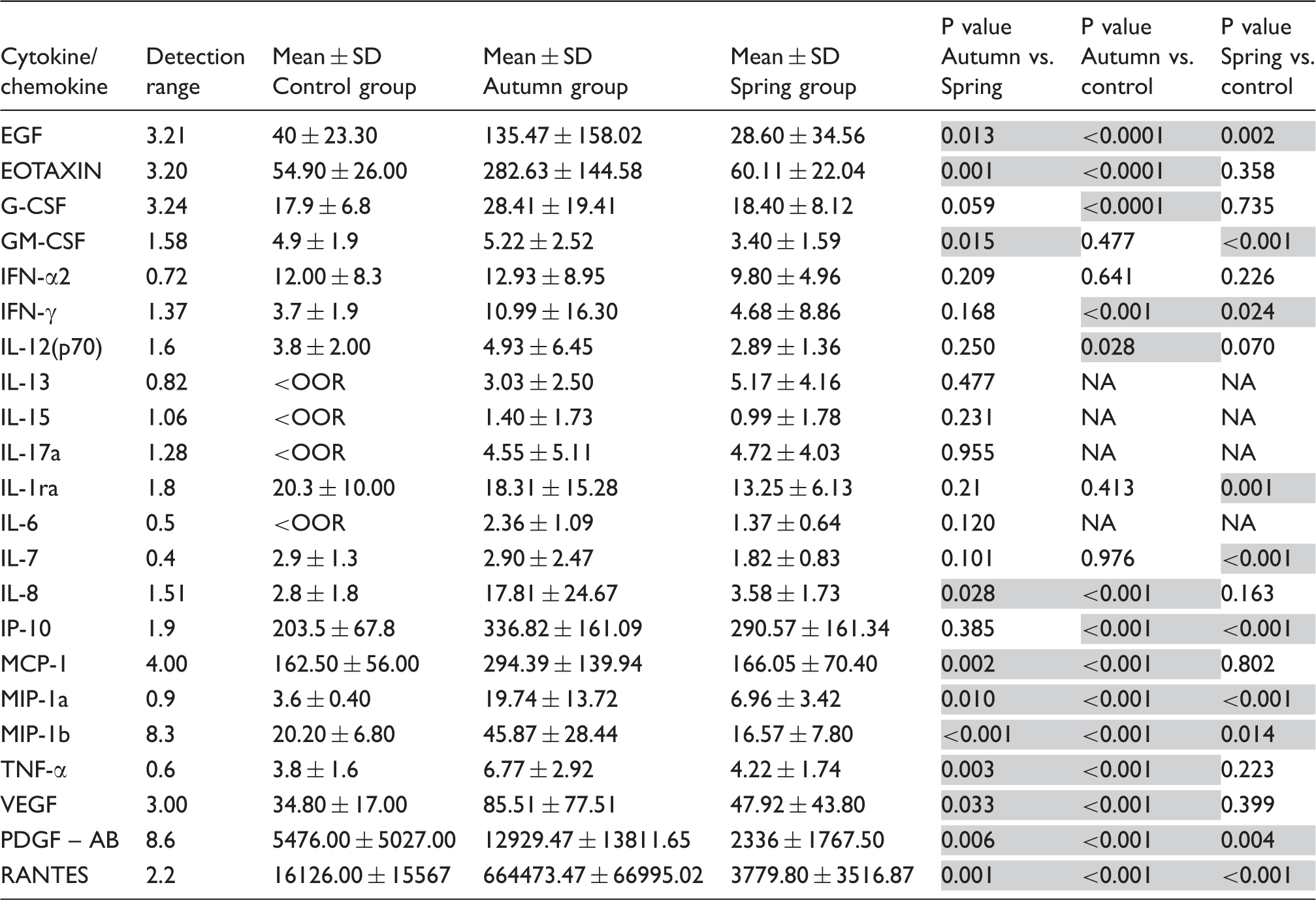 The first and most important finding is that 11 out of 22 cytokines show a statistically significant difference between the group and the Autumn Spring: EGF, Eotaxin, GM-CSF, IL-8, MCP-1, MIP-1 a, MIP-1 b, TNF-α, VEGF, PDGF-BB and RANTES. All of them are known to be pro-inflammatory cytokines.