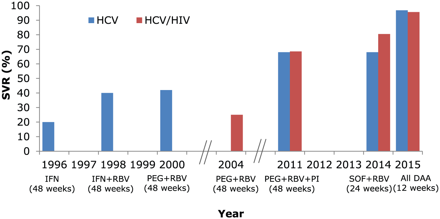Improvements in hepatitis C virus (HCV) treatment and narrowed gap in SVR between HIV/HCV co-infected and HCV mono-infected persons (genotype 1, treatment-naïve).