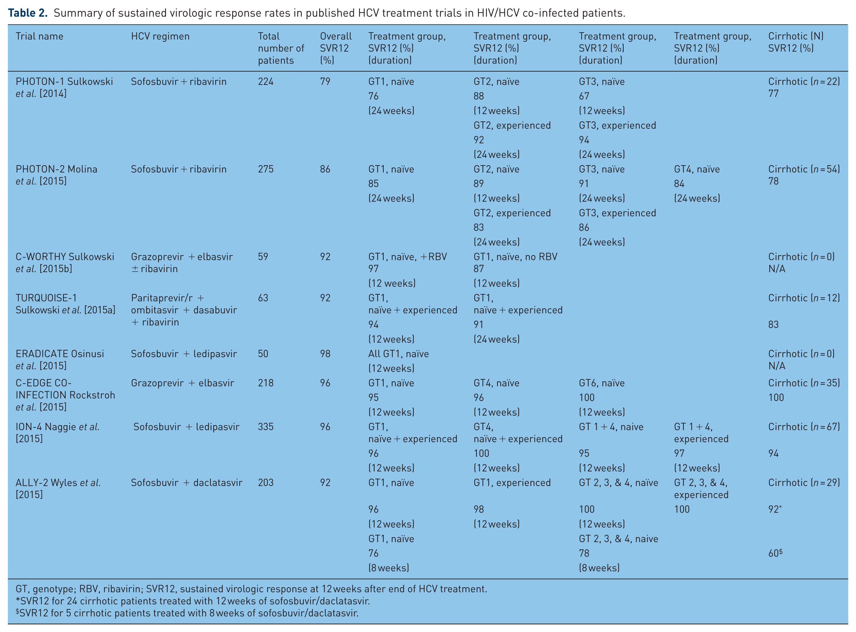 Because co-infected patients with well-controlled HIV infection remain at higher risk of worse clinical outcomes than HIV mono-infected patients, it is imperative that HCV infection also be effectively treated. The goal of HCV treatment is to achieve a sustained virologic response (SVR), which is considered to be cure. The eradication of HCV in co-infected patients is associated with a significantly lower risk of liver-related complications and improved overall survival [Limketkai et al. 2012; Berenguer et al. 2009]. Non-liver-related mortality may also be reduced with HCV clearance [Berenguer et al. 2012].