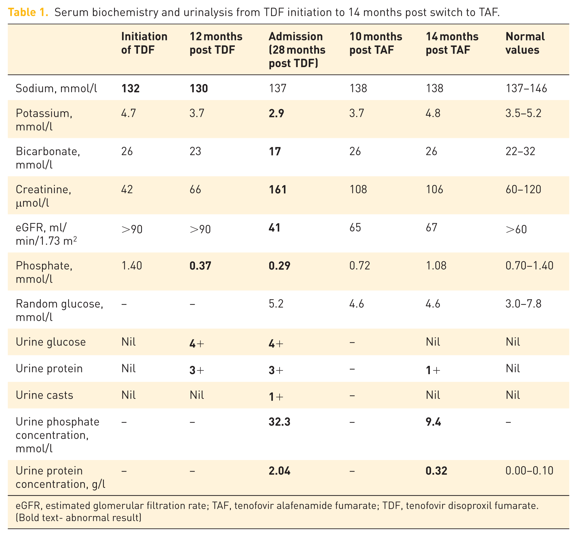 Following discharge, the electrolyte replacement was weaned with close blood test monitoring. Eight weeks after the change from TDF to TAF, the patient remained virologically suppressed. Phosphate replacement was ceased after 3 months on TAF and sodium bicarbonate after 9 months. Serum biochemistry 10 months after commencing TAF demonstrated normal electrolytes, and urinalysis at 14 months revealed no glycosuria, minimal residual proteinuria and a significant reduction in urine phosphate concentration (Table 1).