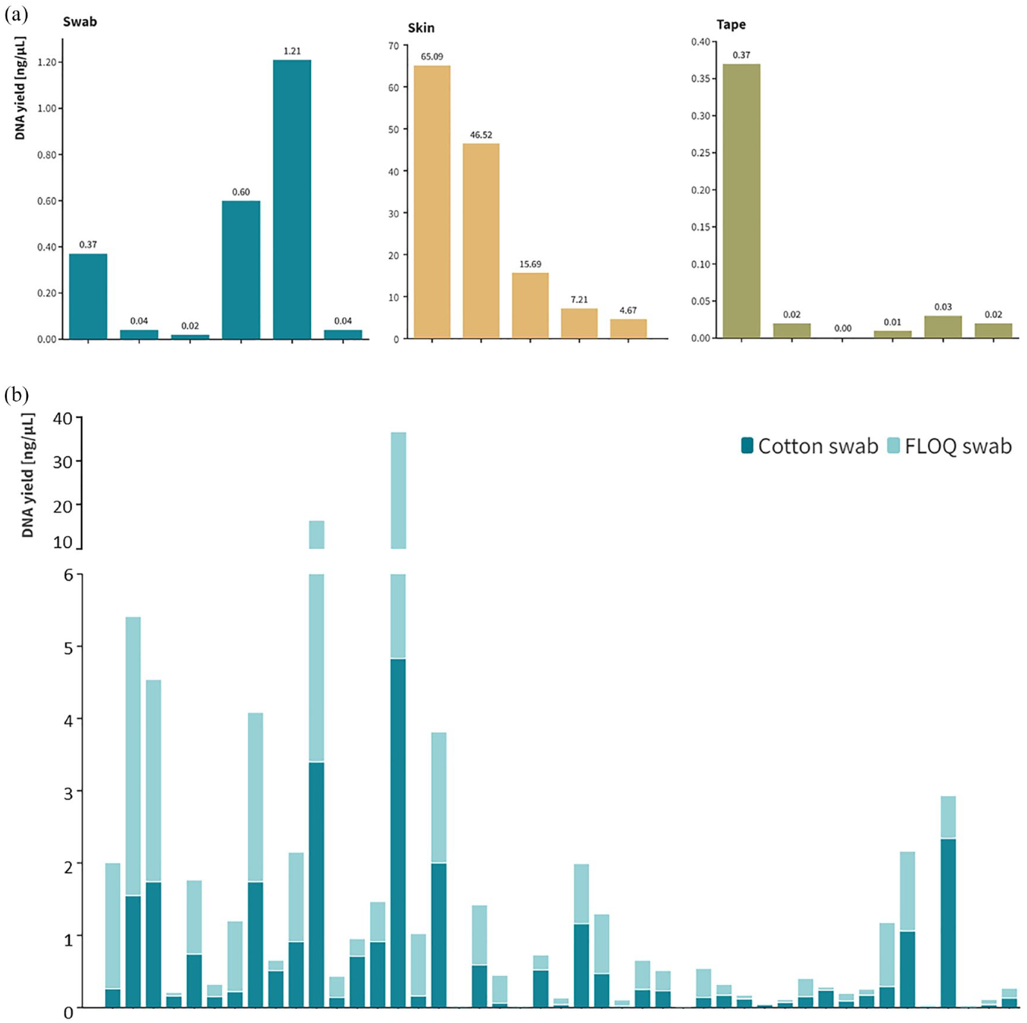 (a) Comparison of the DNA yield (ng/µl) of all the examined sampling methods, that is, swab (
