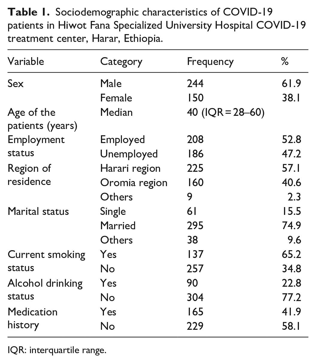 Data of 403 patients who were admitted between 2020 and 2021 were collected, and records of 9 patients were excluded because their date of admission and date of discharged were not well registered. The final analysis was done on 394 patients with a response rate of 97.76%. Majority of the study participants were male 244 (61.9%). The study subjects’ median age was 40 years with an IQR of 28–60 years Table 1.