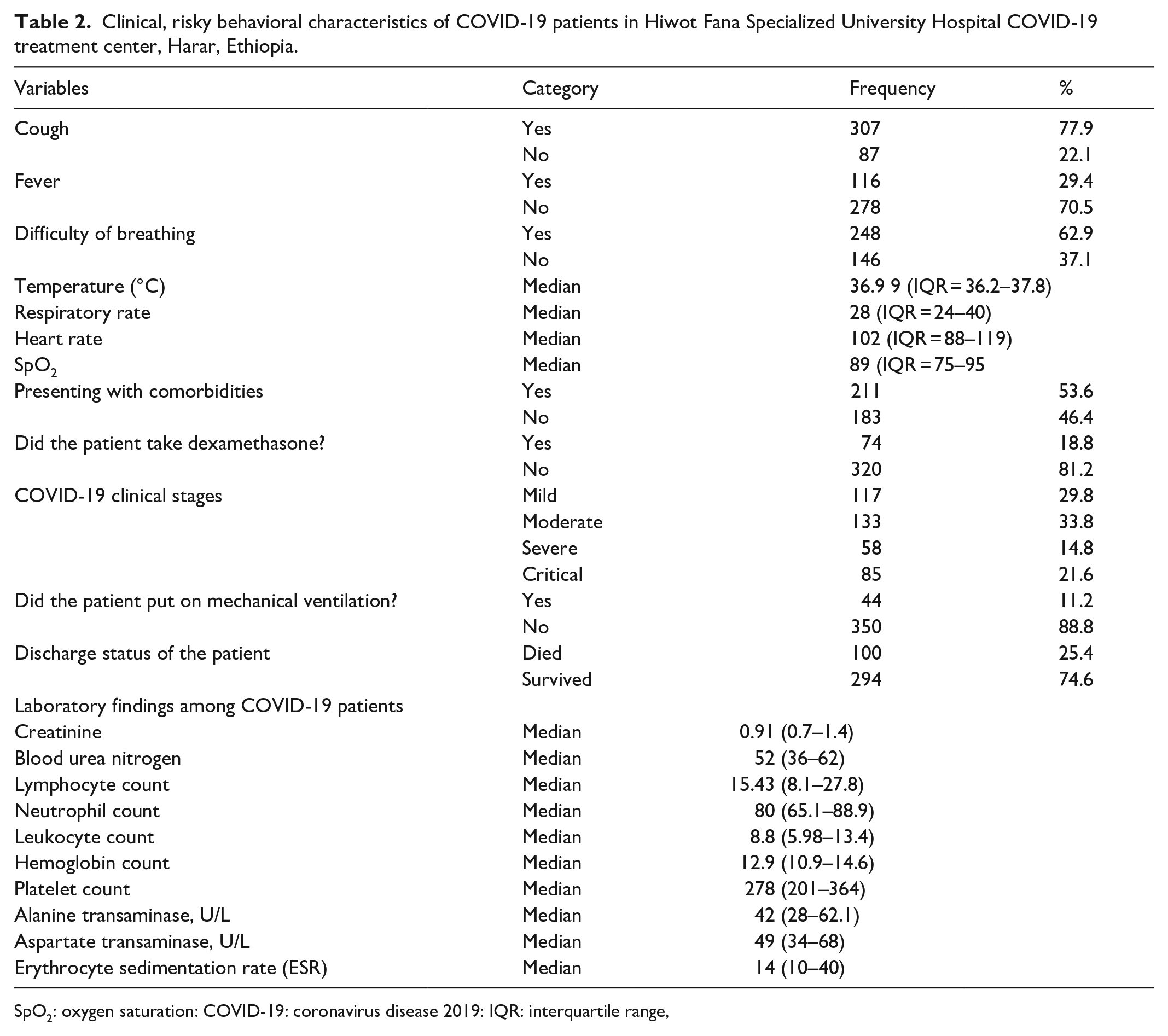 Of the total study participants, 307 (77.9%) and 116 (29.4%) experience cough and fever, respectively. Majority, 248 (62.9), of the study participants develop difficulty of breathing. Besides, the median temperature, respiratory rate, and SpO2 with the IQR were 36.9 (IQR = 36.2–37.8), 28 (IQR = 24–40), 89 (IQR = 75–95), respectively, as shown in Table 2.