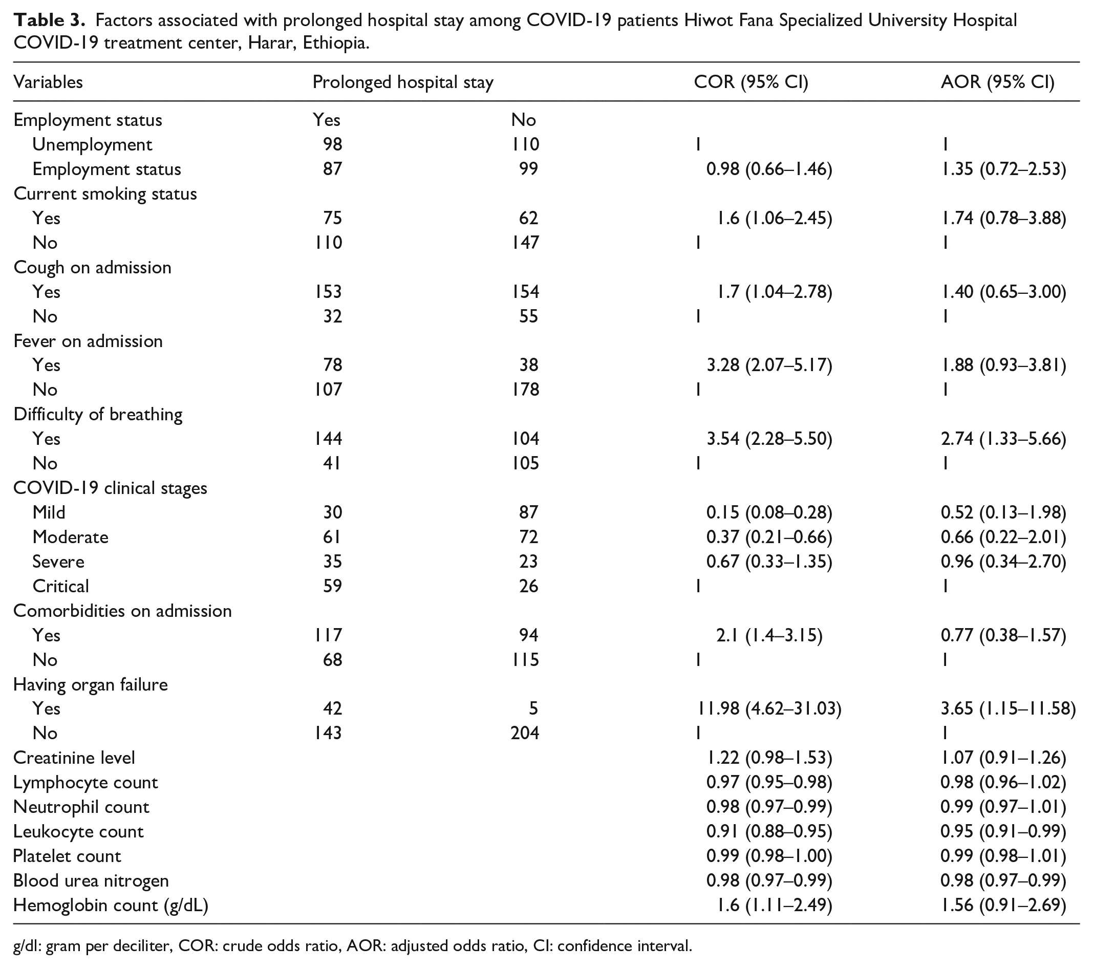 Factors associated with prolonged hospital stay among COVID-19 patients Hiwot Fana Specialized University Hospital COVID-19 treatment center, Harar, Ethiopia.