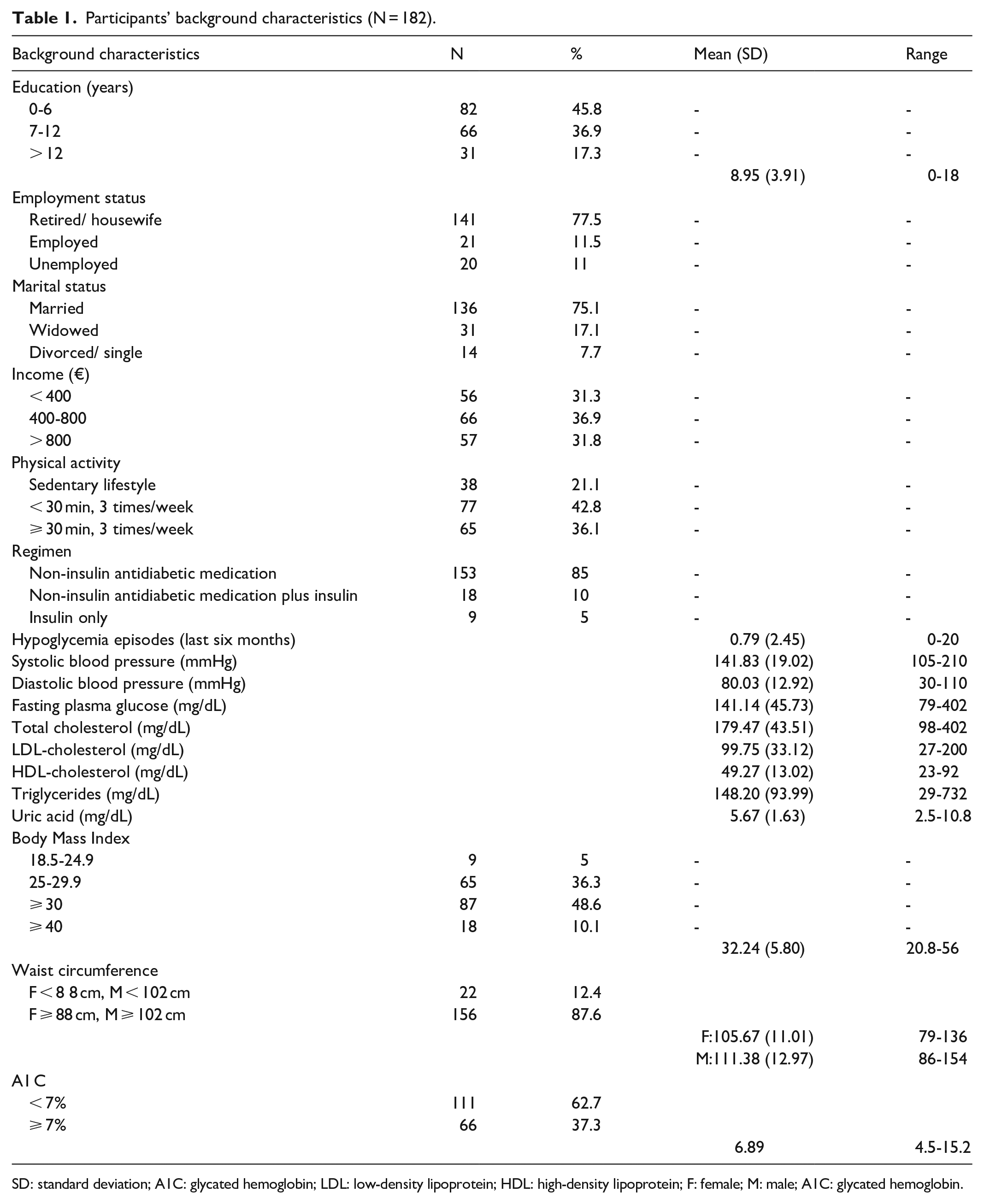 Upon consent, persons eligible and willing to participate were asked a series of questions regarding their background data (i.e. age, marital status, years of education, employment, monthly income, smoking habit, physical activity level, and self-monitoring of blood glucose (SMBG) (number of blood glucose self-tests) per week). The history of prior (lifetime) depression diagnosed by a health care provider, the long-term use of an antidepressant and a benzodiazepine (even intermittently), during the last month and the number of hypoglycemia episodes during the last six months were also recorded. Finally, data derived from the clinical examination, that is, blood pressure (BP), Body Mass Index (BMI) (weight (Kg)/height (m2)), waist circumference, and recent (until up to six months before) laboratory results (A1C, fasting plasma glucose (FPG), lipid status, and uric acid (UA)) were gathered. The low-density lipoprotein cholesterol was calculated via the Friedewald formula 26 and values were not used if triglyceride > 400 mg/dL. BMI categories were defined according to the World Health Organization, 26 and the threshold for an abnormal waist circumference was set at ⩾102 cm for men and ⩾88 cm for women.