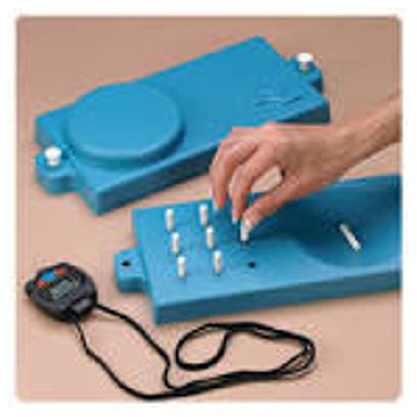 The m9HPT assesses upper limb function through dexterity. In this test, the participant takes pegs from a bowl and places them into the holes of a peg board. 16 A higher score indicates worse dexterity. Measurements are recorded to milliseconds.