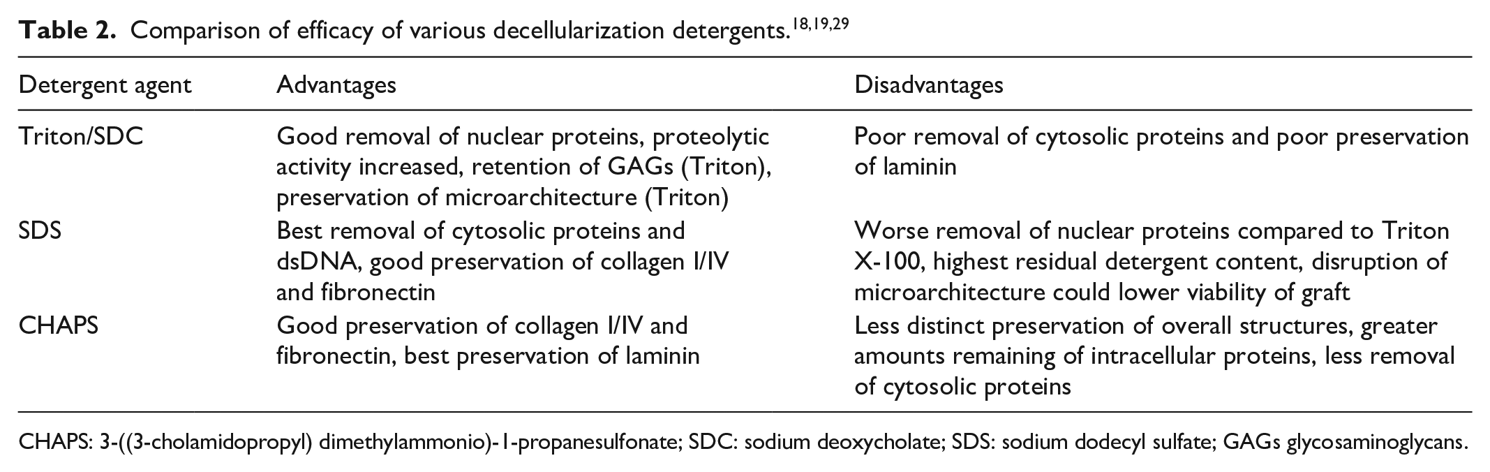 Chemical detergents, with or without supplementary enzymatic treatment, are the most commonly used decellularization agents for VCA grafts. Acidic and alkaline perfusates are less disruptive and immunogenic than chemical detergents; however, they are relatively inefficient at cellular removal and swelling can cause loss of GAGs and viscoelasticity.9,26 Extreme pH can cause further ECM damage. 28 Hypertonic, hypotonic, or enzymatic agents alone are insufficient to achieve decellularization, and trypsin targets collagens, significantly decreasing mechanical strength.9,26 Chemical detergents include non-ionic detergents, such as Triton X, ionic detergents, such as SDS, and zwitterionic detergents, such as CHAPS. Non-ionic detergents disrupt lipid–lipid, lipid–protein, and DNA–protein interactions, ionic detergents solubilize cell and nucleic membranes, and zwitterionic detergents demonstrate ionic and non-ionic properties. 29 The impact on cell removal and ECM preservation for each solution is summarized in Table 2.