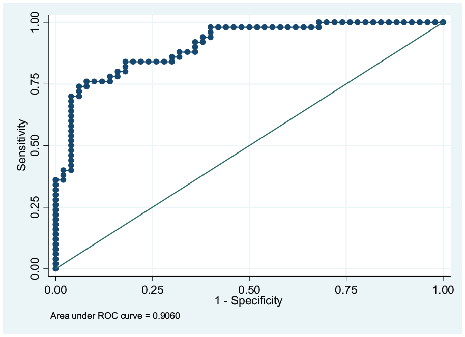 Figure 1 demonstrates the area under the ROC curve for significant variables included in the multivariable logistic regression model which the area under the ROC curve was 90.60%, which demonstrates the high discriminative power of this model.