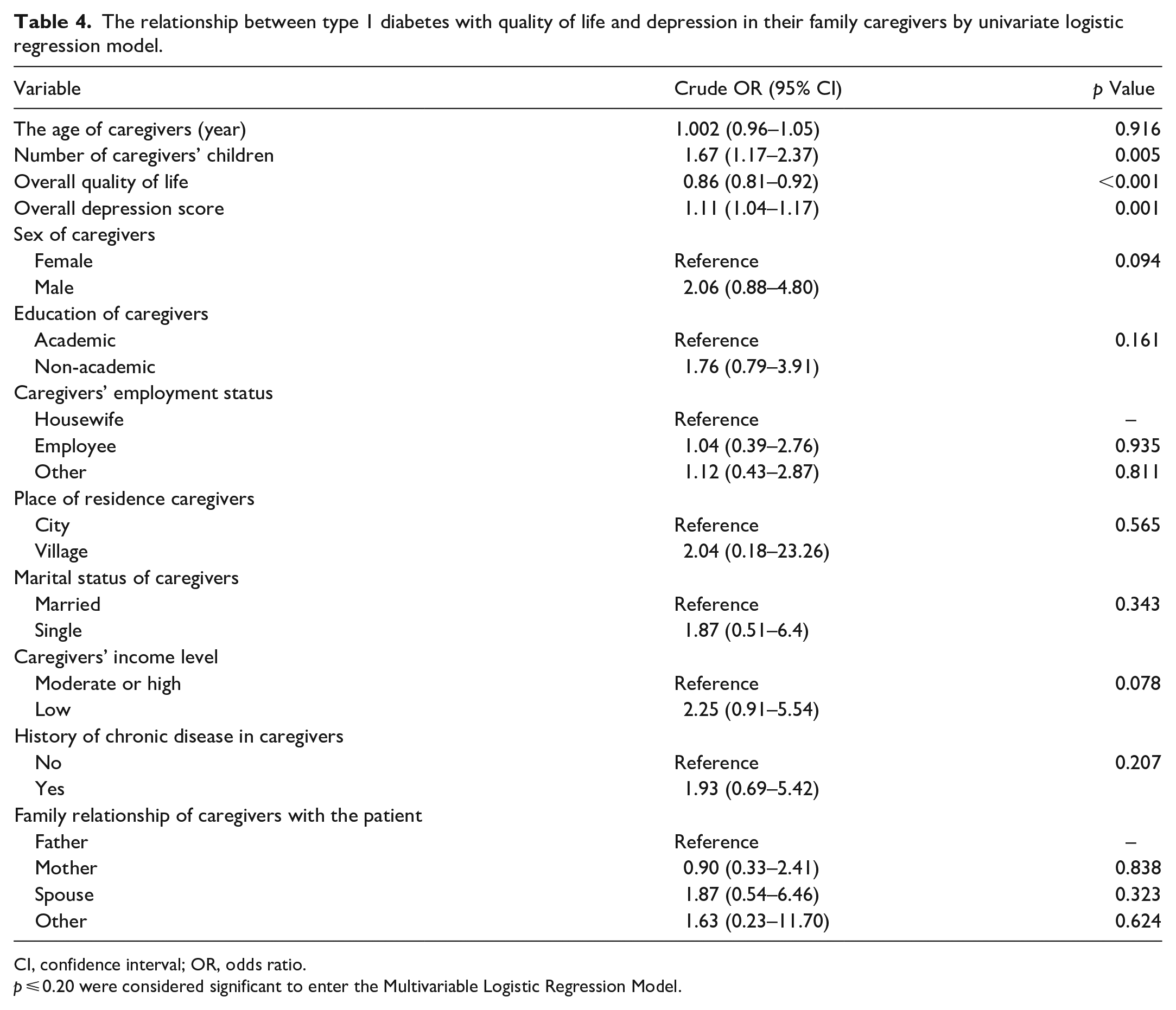The relationship between type 1 diabetes with quality of life and depression in their family caregivers by univariate logistic regression model.