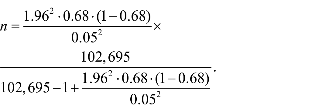 The sample size was calculated based on a study conducted by Pittman et al., which estimated an effect size of 68% among the study participants. 20 The authors identified time as the most significant barrier to writing and publishing. For the calculation, a confidence level (1-Alpha Error) of 95%, a margin of error of 5%, a population proportion of 68%. The total population size of faculty staff was 102,695 in higher education in Egypt, in the same year were considered. Consequently, the final determined sample size was 334. Considering an attrition rate of 24, the final sample size was adjusted to 358.