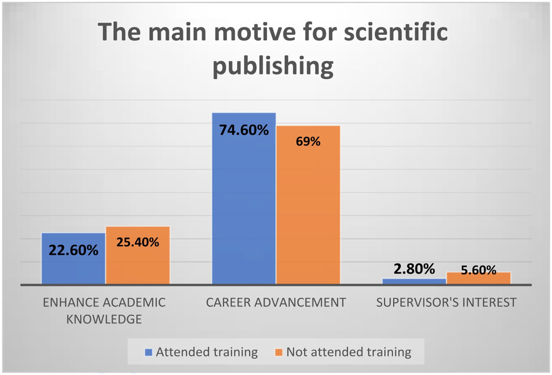 According to the primary motives for scientific publishing among faculty members, revealing that career advancement is the predominant motive, cited by 74.6% of trained and 69% of untrained faculty. Enhancing academic knowledge is another significant motive, with 22.6% of trained and 25.4% of untrained faculty indicating it as their primary reason. This suggests that while training attendance impacts the recognition of career advancement as a motive, it has less influence on the other motives.