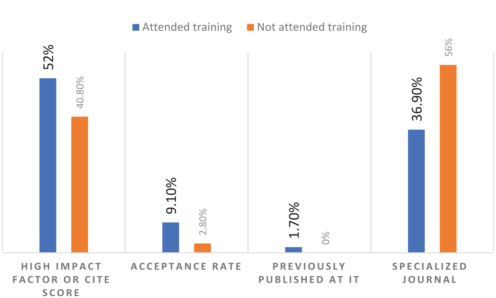 The factors affecting the selection of journals for scientific publication include a high impact factor or citation score is a significant consideration for 52% of trained faculty compared to 40.8% of untrained faculty. Acceptance rate and prior publication in the journal are less significant factors for both groups. This could indicate that trained faculty are more inclined toward broader recognition through high-impact journals. These results supported with the study by Tenopir et al. 26 identify quality and reputation of the journal, fit with scope of the journal, audience, and impact factor as factors to select the journal. Additionally, Rowley et al. 27 highlighted other influential factors, including the reliability of the review process, the usefulness of reviewers’ feedback, the reputation of the journal, and confidence that their article aligns with the journal’s scope.