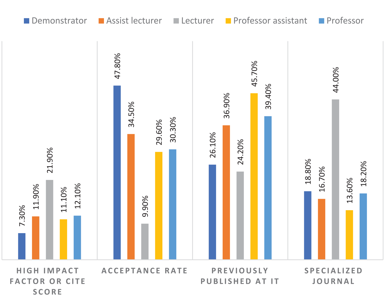 Figure 3 illustrates the distribution of preferences among faculty staff for selecting journals for scientific publication based on their academic positions (