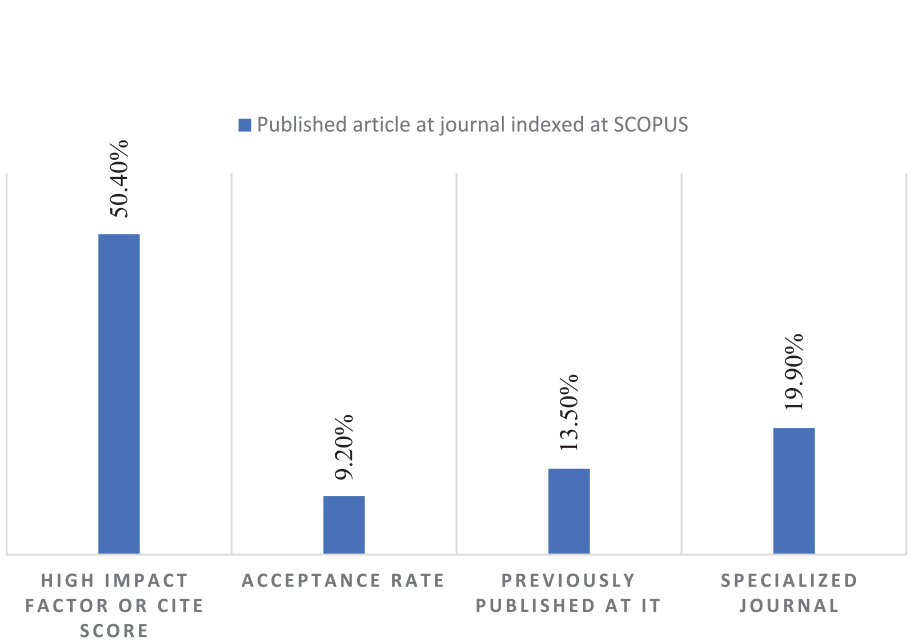 Figure 4 shows that the most significant factor is the High Impact Factor or Cite Score, with 50.40% of faculty staff considering it crucial. This is followed by the preference for Specialized Journals at 19.90%. Previous publication at the journal accounts for 13.50% of the preferences, indicating some importance placed on familiarity with the journal.