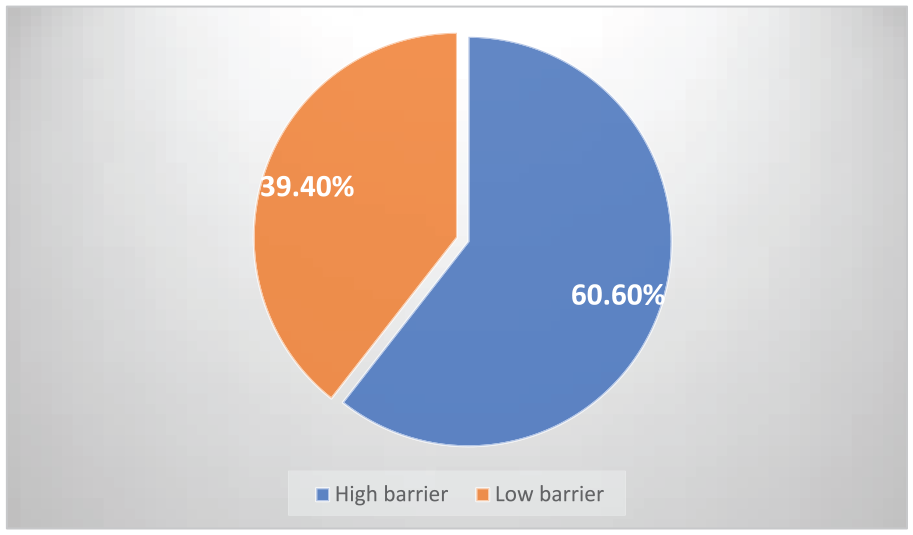 The study utilized a scoring system where participants rated each item as either “agree” (1) or “disagree” (0). A higher score denoted a higher level of barriers. We gathered scores for each participant’s items, resulting in a total barrier score of 34. If the score fell between 20 and 34, it was classified as “high barriers”; if it fell between 0 and 19, it was classified as “low barriers.”