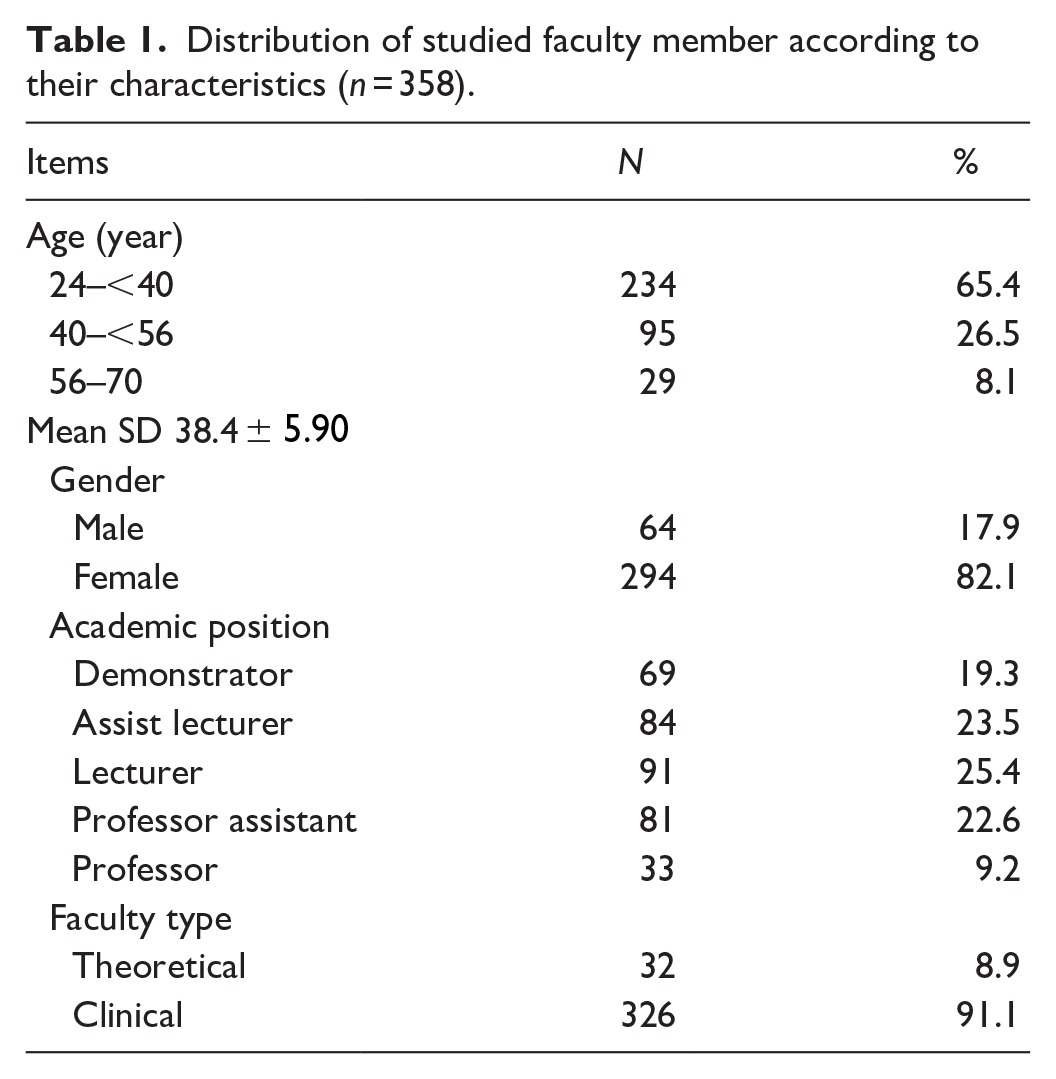 A descriptive cross-sectional design was implemented from 1 March to the end of May 2022. The convenience sample consisted of 358 faculty members from eight universities in Egypt, representing five practical faculties (Nursing, Medicine, Science, Pharmacy, and Engineering) and three theoretical faculties (Al-Alsun (Languages), Arts, and Commerce). These universities included Ain Shams, Cairo, Mansoura, Benha, Assiut, 6th of October, BUE, among others.