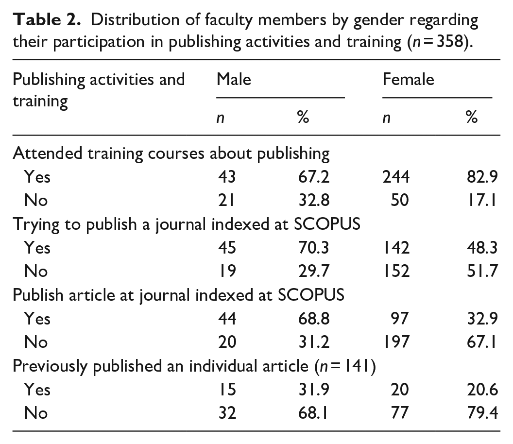 Table 2 illustrates the distribution of faculty members by gender regarding their participation in publishing activities and training. It shows that a higher percentage of both male (67.2%) and female (82.9%) faculty members have attended training courses about publishing, with females having a notably higher attendance rate. When it comes to trying to publish in journals indexed at SCOPUS, 70.3% of males and 48.3% of females have attempted, indicating a significant gender disparity. For actual publications in SCOPUS-indexed journals, 68.8% of males succeeded compared to only 32.9% of females. Additionally, the data on previously published individual articles reveal that 31.9% of males and 20.6% of females have such publications, highlighting a notable gender gap in publishing achievements.