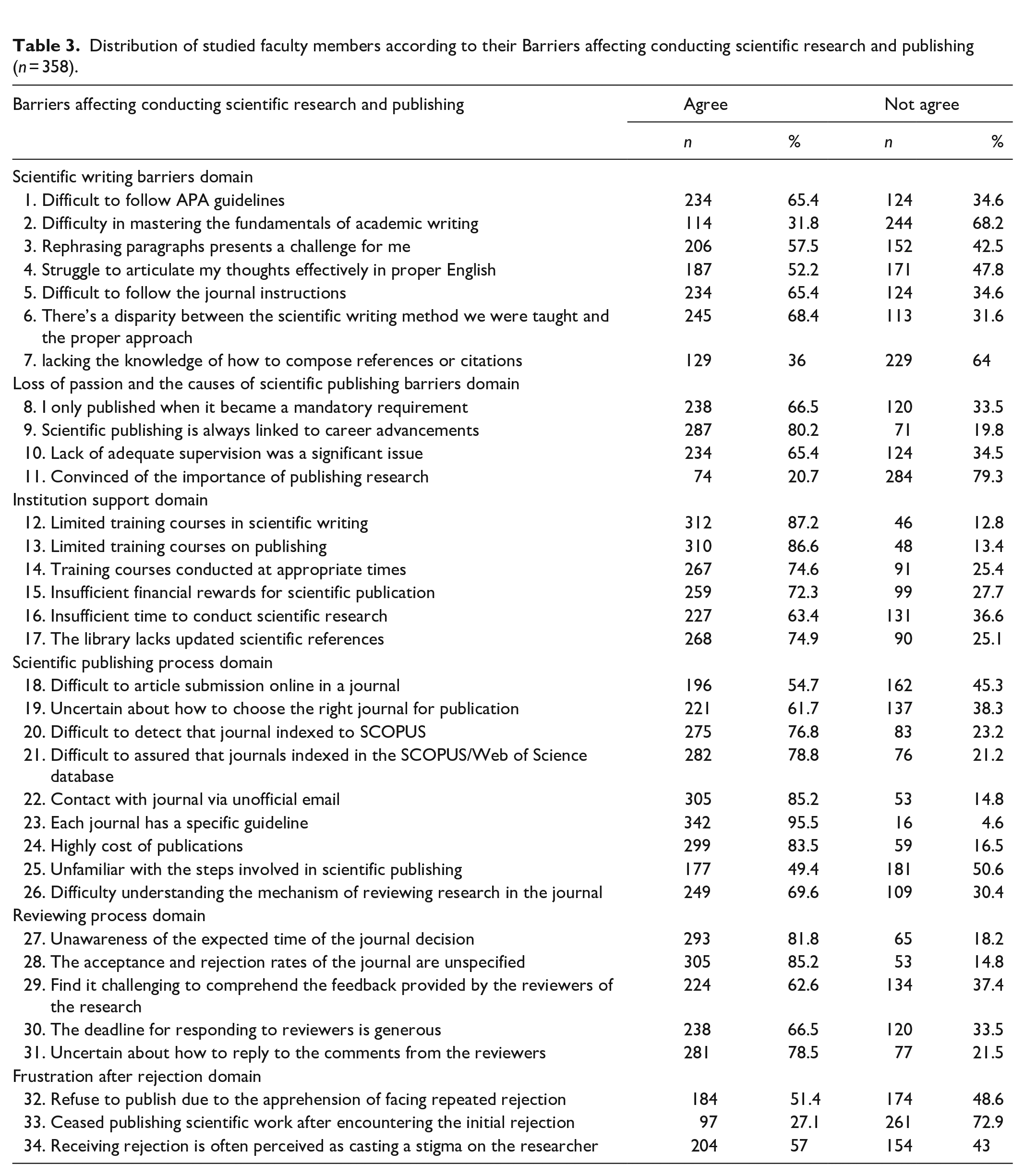 Hammad and Al-Ani 18 conducted a study among faculty members at Oman University, which revealed several challenges that impede educational research, including time constraints, the absence of a collaborative research culture, and the lack of a clear research agenda. The study also recognized several opportunities for capacity building, such as a research-supportive environment, availability of research funding, and the role of research groups. Furthermore, Lages et al. 19 conducted a study in the Middle East and Africa regions, reporting that the most frequently described challenges included data validity and reliability, language barriers, issues with data collection, and the availability of a network of researchers. The current study aimed to assess the challenges and barriers that faculty members face when publishing their work. This exploration aims to shed light on the challenges faced by faculty members in publishing their scientific research. By delving into the intricacies of these barriers, we can gain a deeper understanding of the factors that hinder the publication process and hinder the dissemination of valuable research findings. Through empirical investigation and analysis, we aim to identify the key challenges faced by faculty members and propose potential solutions to promote successful research publication.