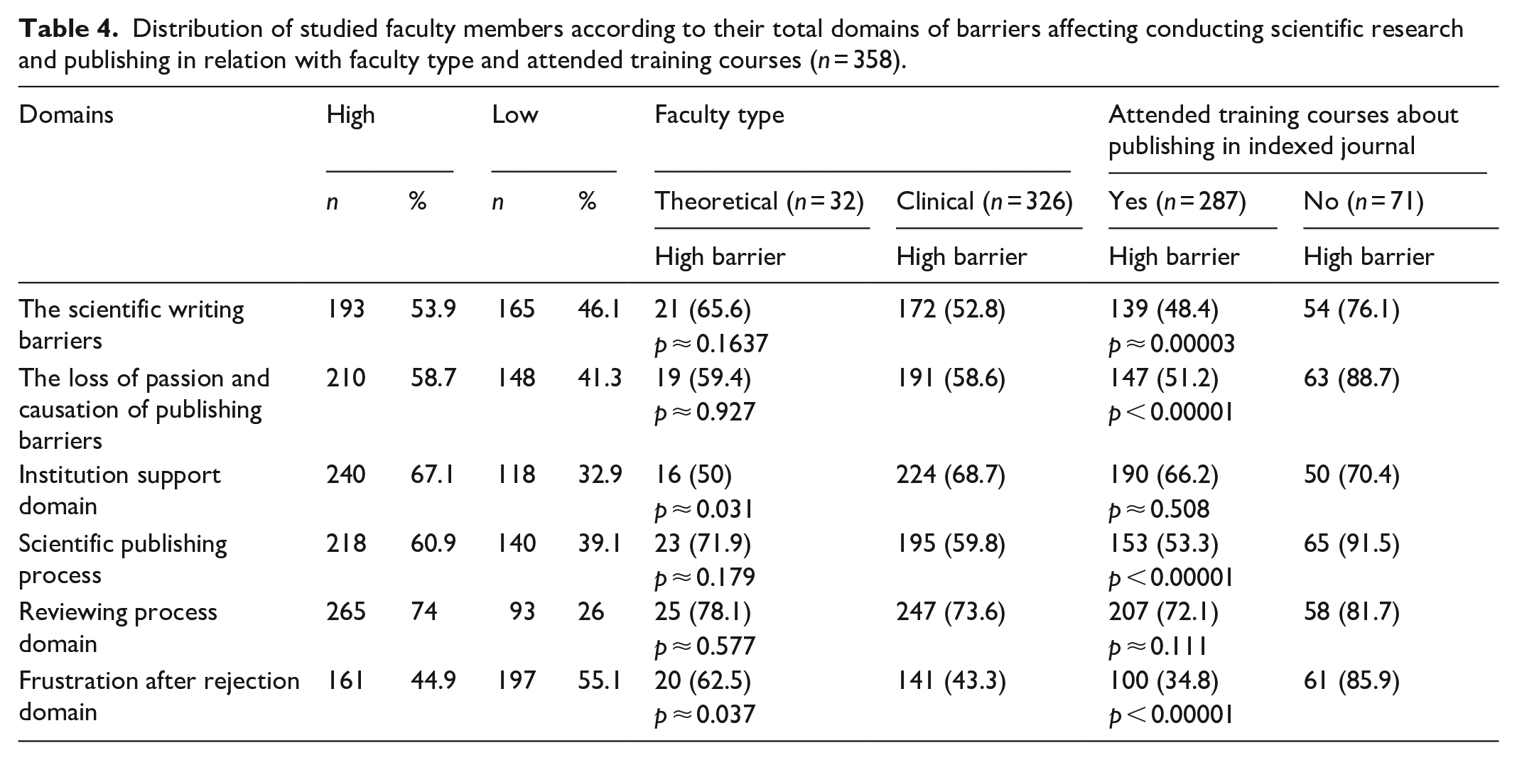More than half (53.9%) of faculty members reported high barriers related to the scientific writing domain, with a higher percentage among theoretical faculty (65.6%) compared to clinical faculty (52.8%). There is a significant difference based on training attendance (