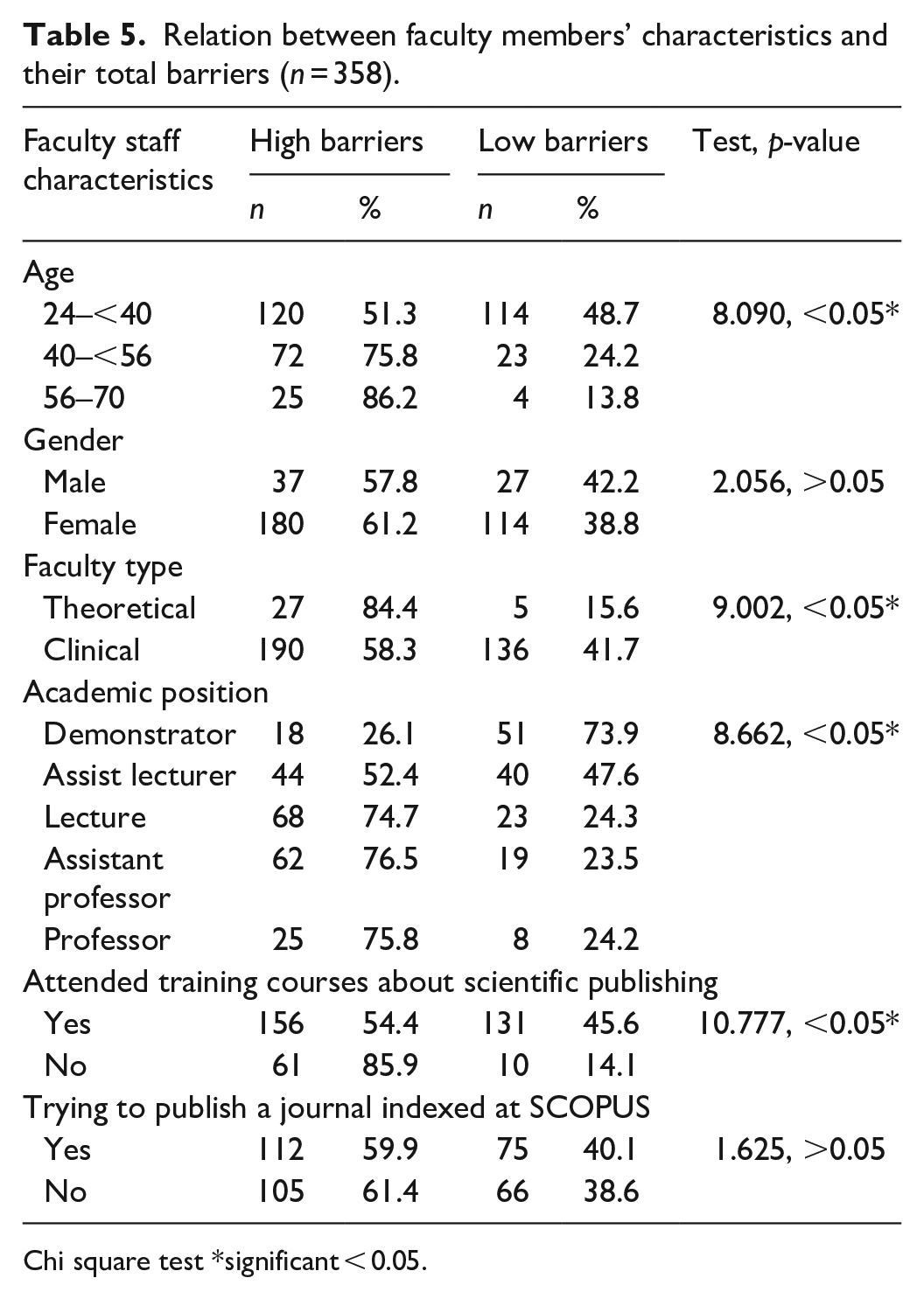 Table 5 summarizes the relationship between faculty member characteristics and their total barriers related to publishing scientific research. The results showed that faculty staff aged 56–70 years had significantly higher barriers (86.2%) compared to those aged 24–40 years who had lower barriers (48.7%), with a significance level of