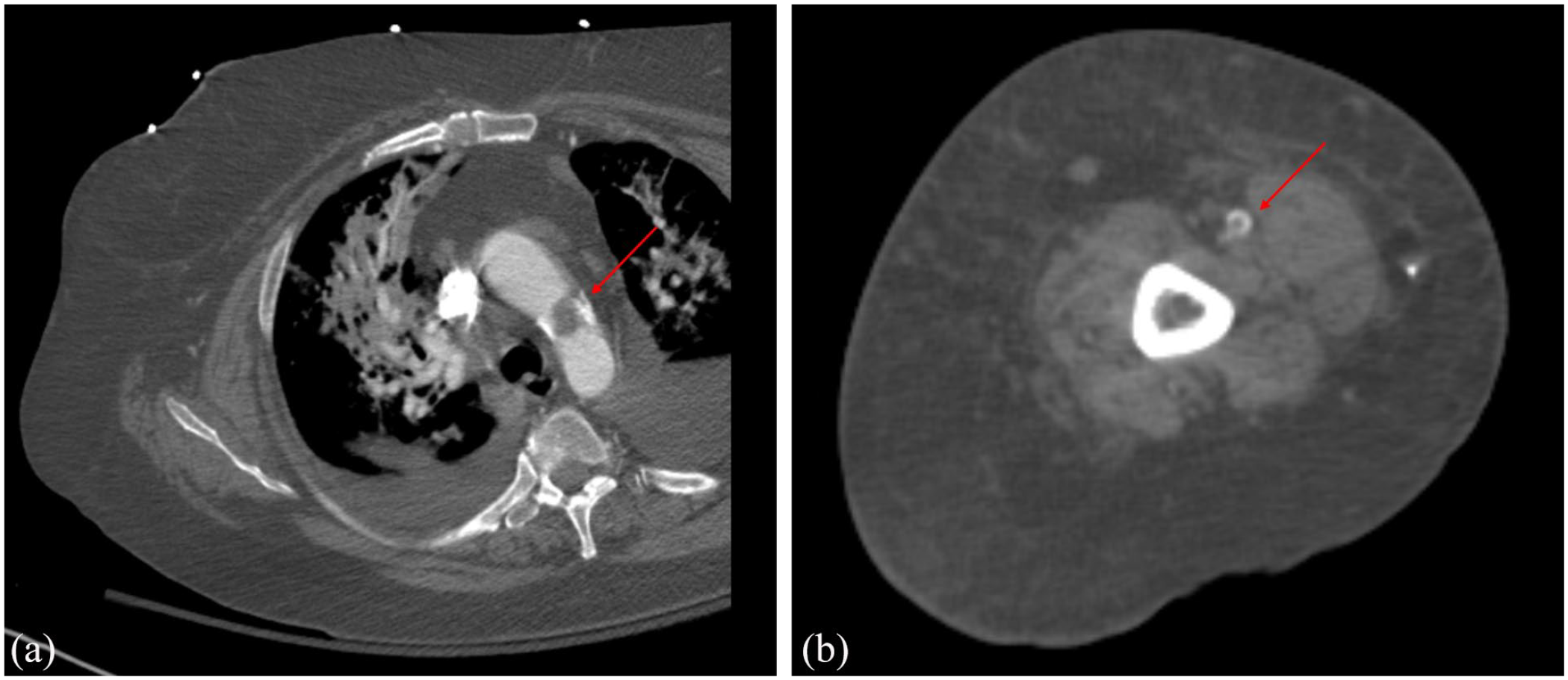 Representative images from the CT angiography of the chest and the right upper extremity: (a) nonocclusive arterial thrombus within the midportion of the aortic arch and (b) partially occlusive thrombus within the right brachial artery.