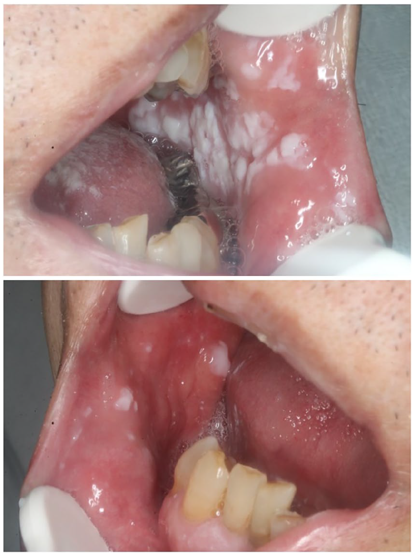 The patient was a 75-year-old man patient with a medical history of atrial fibrillation taking warfarin. Fever and impaired consciousness were noted in mid-March 2020, and the patient was transferred to our hospital as an emergency. COVID-19 pneumonia was suspected due to a history of close contact with spouse who had COVID-19, increased fever and respiratory rate, decreased permeability of the right whole lung field on chest X-ray, and accumulation of pleural effusion. He was urgently admitted via the emergency department. A positive polymerase chain reaction test result for COVID-19 was confirmed, and a definitive diagnosis of COVID-19 pneumonia was made. After admission, an oral combination of lopinavir/ritonavir (800 mg/200 mg/ day, twice daily) was administered, and ciclesonide (800 µg/day, twice daily) was inhaled for 7 days. On the 7th day of hospitalization, aspiration pneumonia was observed. On the 14th day of hospitalization, white plaque began to appear in the oral cavity. At the first visit to our department on the 14th day, white plaque was found on both buccal mucosa and the back of the tongue, but there was no oral pain or dysgeusia.