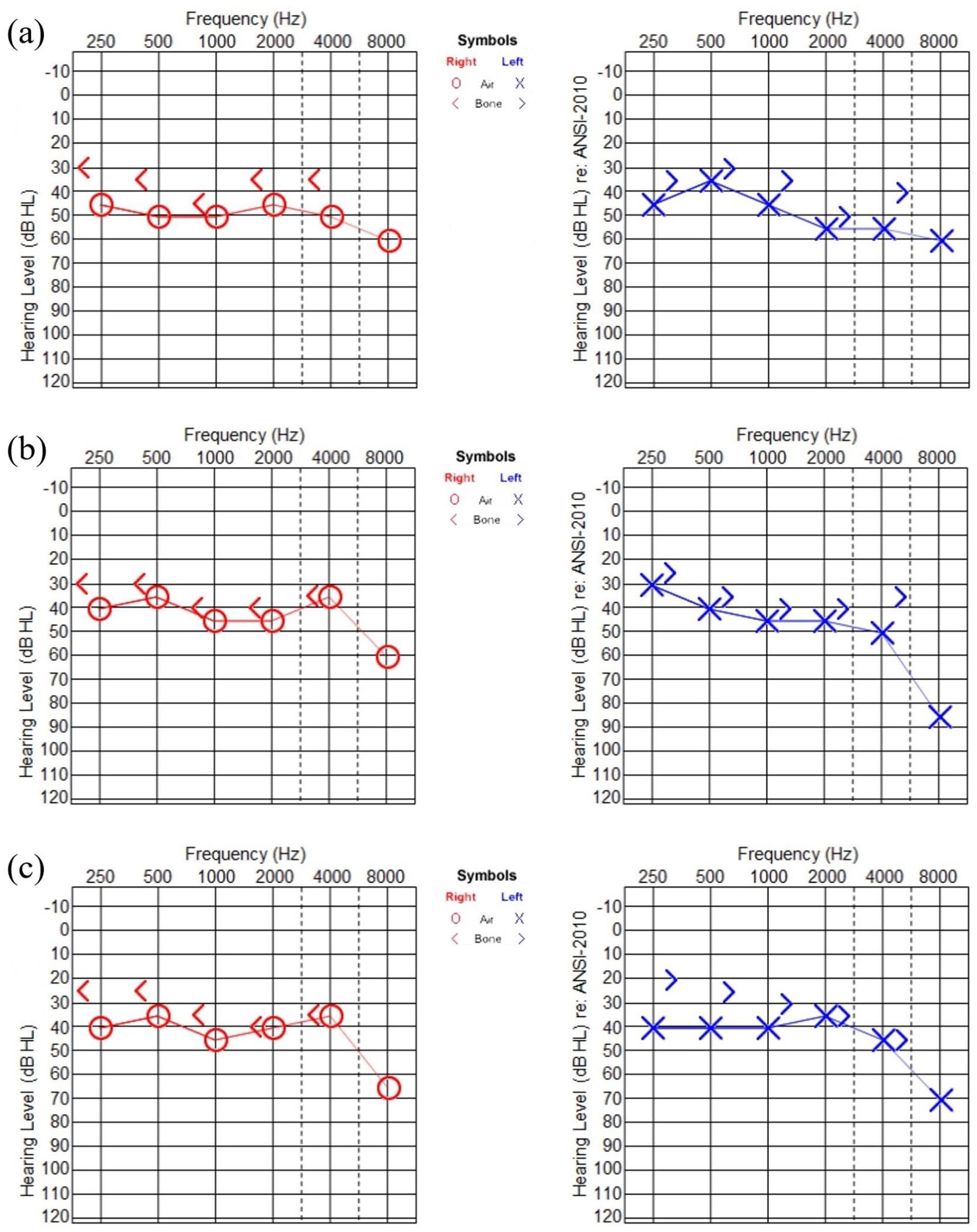 (a) Baseline audiometry on first encounter, SNHL at 1 kHz on the right, 500 Hz and 2 kHz on the left. Rest of frequencies with CHL. (b) Second audiograms after 2 weeks, SNHL at 500 Hz and 8 kHz on the right and 8 kHz on the left. Rest of frequencies with narrow air-bone gap concluding CHL. (c) Third audiograms after 4 weeks, SNHL at 2, 4, and 8 kHz on the right and 2, 4, and 8 kHz on the left. Rest of frequencies with CHL.