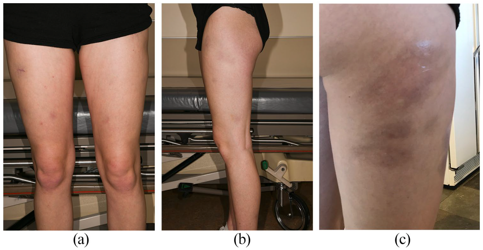 Multiple painful gray-brown subtly indurated and depressed round nodules most prominent on the anterior (a) and lateral thighs bilaterally (b and c), initially diagnosed as lupus erythematosus panniculitis on skin biopsy before other clinical manifestations of juvenile dermatomyositis presented.