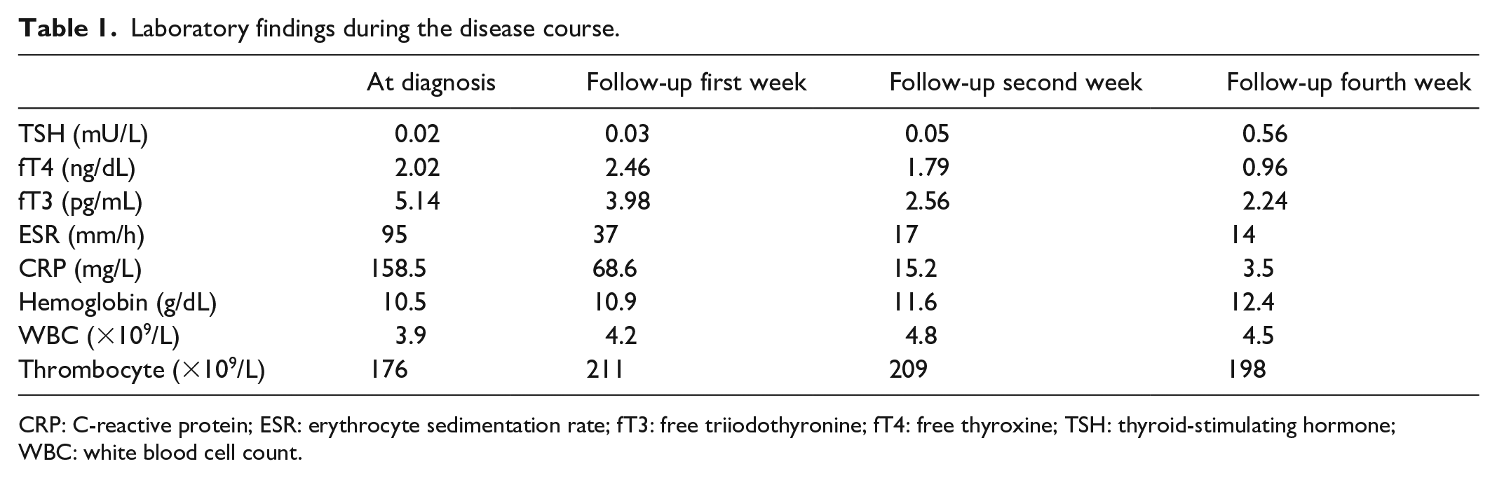 CRP: C-reactive protein; ESR: erythrocyte sedimentation rate; fT3: free triiodothyronine; fT4: free thyroxine; TSH: thyroid-stimulating hormone; WBC: white blood cell count.