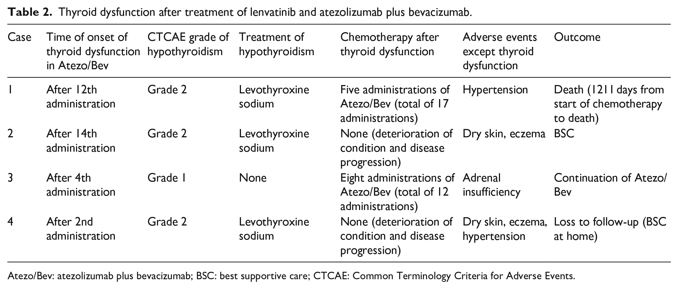 Four patients received Atezo/Bev following lenvatinib. All four patients developed thyroid dysfunction during second-line treatment with Atezo/Bev. A study based on health and medical service data (n = 665,445) found that the incidence of hypothyroidism was 4.4 times higher (odds ratio = 4.41, 95% confidence interval = 3.40–5.71) in cancer patients who receive ICIs with cytotoxic chemotherapy and angiogenesis inhibitors than in those who received ICIs alone. 9 TKIs such as lenvatinib have been reported to cause thyroid dysfunction by acting on the hypothalamus–pituitary–thyroid system.10,11 Thyroid dysfunction has been reported after treatment with epidermal growth factor receptor (EGFR)/anaplastic lymphoma kinase (ALK) TKIs, such as erlotinib, gefitinib, ceritinib, and crizotinib, in patients with non-small cell lung cancer 12 and after TKI administration in patients with renal cell carcinoma.13,14 Thyroid dysfunction can occur after first-line treatment with lenvatinib; however, the four patients in this report did not have thyroid dysfunction after first-line treatment with lenvatinib.
