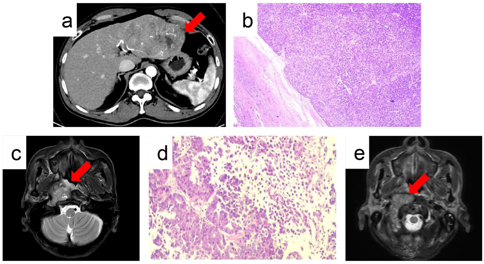 Diagnostic imaging and histopathology of HCC and its pharyngeal metastasis. (a) Arterial phase abdominal CT scan (September 5, 2020) revealing a large hepatic mass (arrow) prior to resection. (b) Photomicrograph of the resected liver specimen (H&E stain, 10× magnification) showing nodular-trabecular HCC (September 8, 2020). (c) Contrast-enhanced MRI of the head and neck (November 3, 2024) demonstrating a large, enhancing mass in the right oropharyngeal region (arrow). (d) Pathological images (November 6, 2024) obtained from ultrasound-guided needle biopsy (H&E stain, 10× magnification) confirming metastatic HCC. (e) Contrast-enhanced MRI of the head and neck (March 9, 2025) showing significant reduction in the size and enhancement of the metastatic oropharyngeal mass (arrow) following radiotherapy.