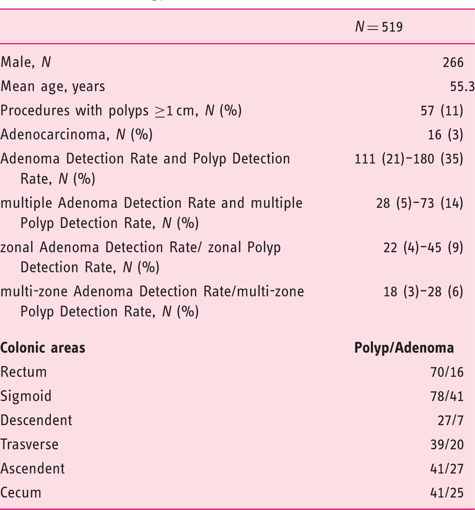 In order to bypass some spatial limitations of ADR, we aimed to test new parameters, namely: the multiple Adenoma Detection Rate (mADR), the zonal Adenoma Detection Rate (zADR) and multi-zone Adenoma Detection Rate (mzADR), developed in order to maximize segmental evaluation during endoscopy. In detail, mADR was defined as the percentage of patients with ≥2 adenomas diagnosed during colonoscopy, the zADR as the percentage of patients with ≥2 adenomas diagnosed during colonoscopy in different colon areas (rectum, sigmoid, descending, transverse, ascending and cecum colon), and the mzADR as the percentage of patients with ≥2 adenomas diagnosed during colonoscopy in different colon areas with at least a segment between them with or without lesions (i.e. rectum and descending colon with or without lesions in the sigmoid). The corresponding values were also assessed for polyps, namely mPDR, zPDR, mzPDR.