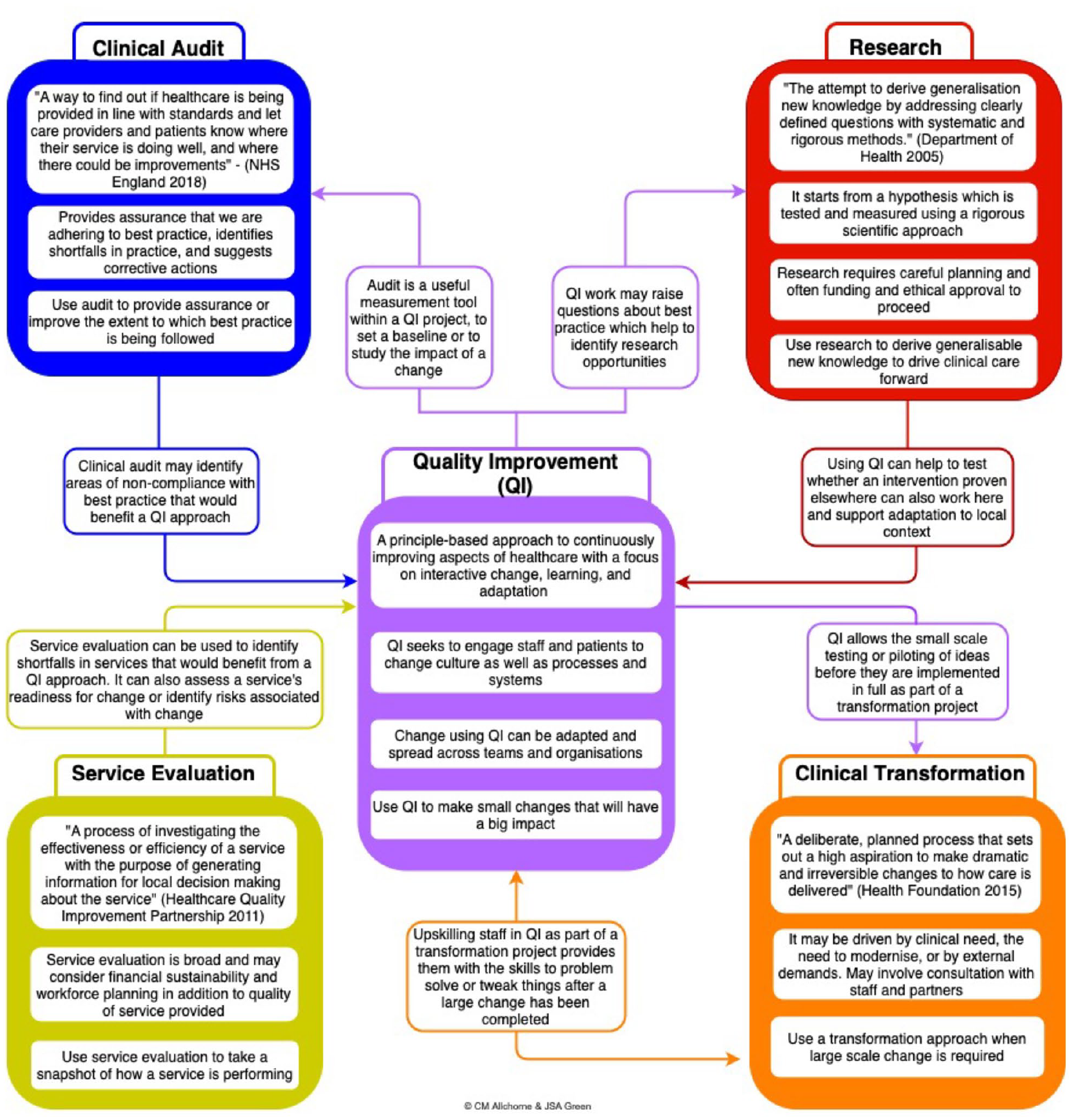 The intersection between Quality Improvement, Audit, Research, Service Evaluation and Clinical Transformation.