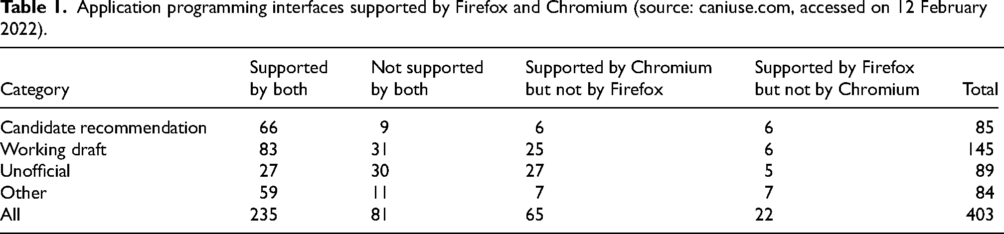 Application programming interfaces supported by Firefox and Chromium (source: caniuse.com, accessed on 12 February 2022).