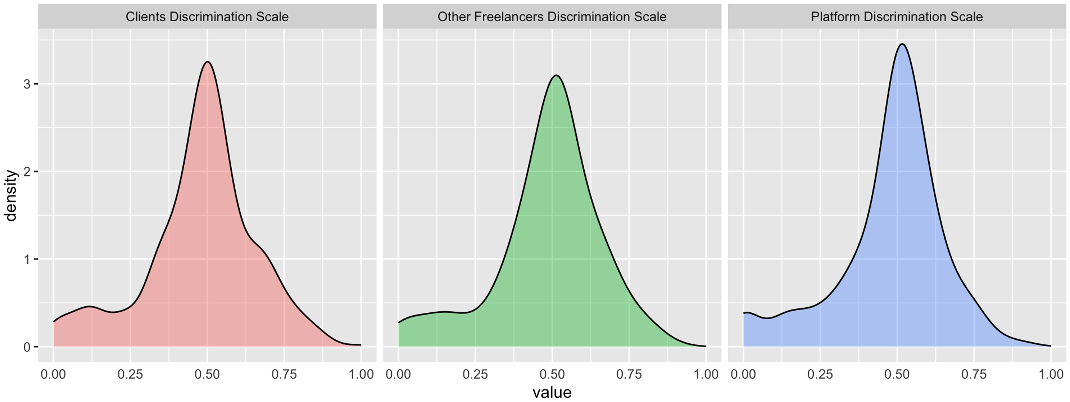 Density of discrimination from clients, colleagues, and freelancing platforms as reported in the survey.
