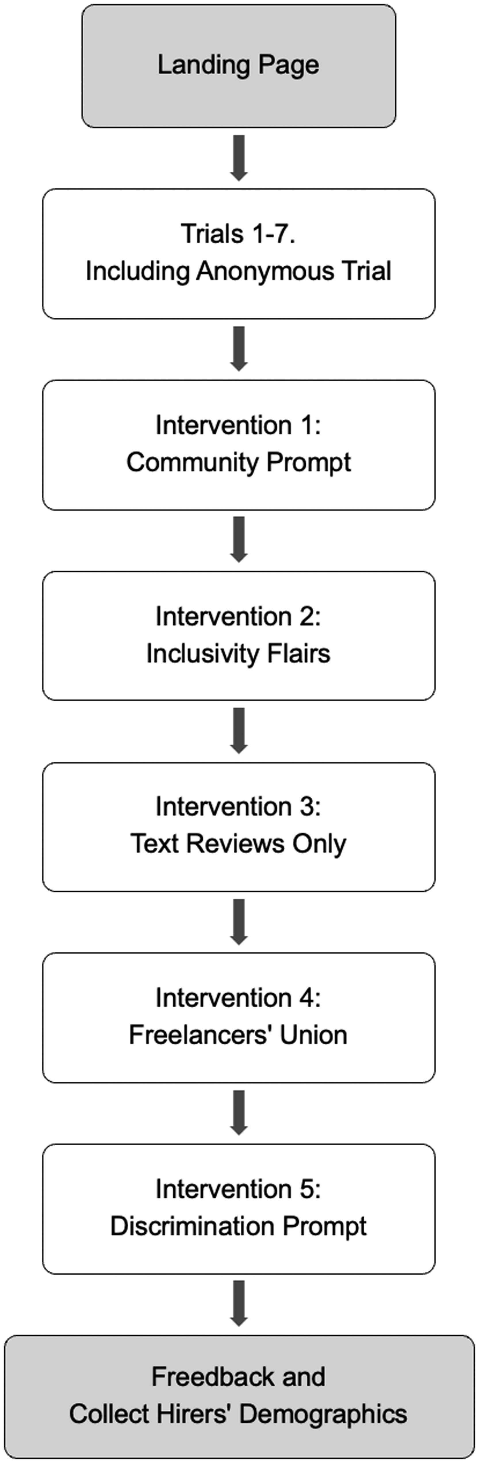 Our implementation of DCA contained four sections: (a) Reference trials 1—7, a hiring choice without intervention for a baseline, (b) Interventions 1—5 shown in Table 3, (c) Feedback on the website design in a free-text box, and (d) Socio-demographic questions. The implementation of the interventions is shown in Figure 4. The experiment presented participants with seven discrete-choice tasks without interventions in the reference trials. The reference trials were structured to replicate the choices generated for the interventions to allow for comparison. The flow of the experimental research design is shown in Figure 5.
