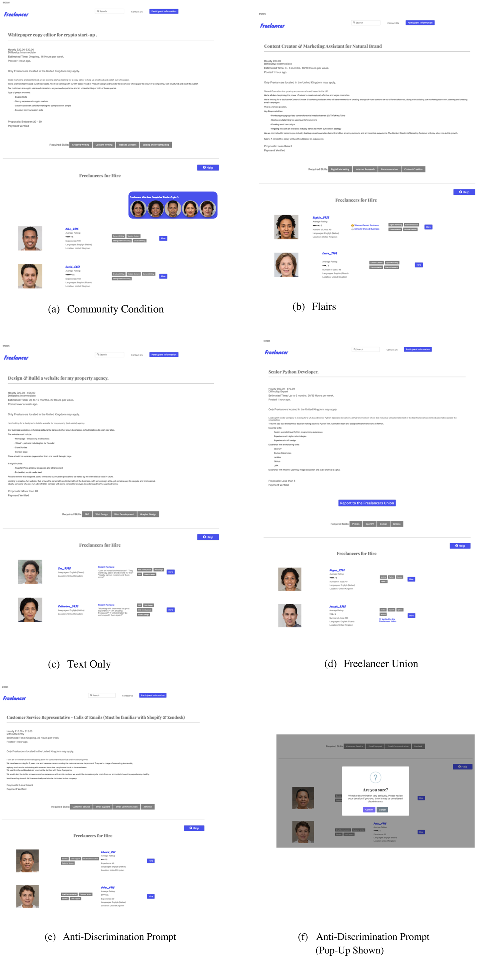 Future research should model if interventions can affect the price a freelancer is awarded for a project. While our data do not allow us to infer the mechanisms for this preference, other studies have suggested that gendered assumptions may lead to these observed outcomes (Cerqua and Urwin, 2018; Galperin, 2021; Hong, 2016). Our study could be expanded upon in the future by testing if South and East Asian freelancers may be preferentially hired due to assumed lower rates. Given the significant effects of community, flairs, and text interventions, our study indicates that more research on user-interface is warranted. For instance, researchers should examine how hirers interact with filtering mechanisms on OLMs to find freelancers and if identity-signalling flairs could assist with designing justice on OLMs. Future research should complement investigations of algorithmic structures with a critical analysis of how platform design communicates affordance to its users. Our study can additionally be expanded upon with a natural experiment, such as that conducted by Hangartner et al. (2021), to ascertain if the findings are repeated in a natural setting. How gender and ethnicity biases are reflected in these metrics and in freelancers’ payment for their work will be a fruitful avenue for future research. This study provides experimental evidence of paths forward that can enable OLMs to function in a more equitable manner.