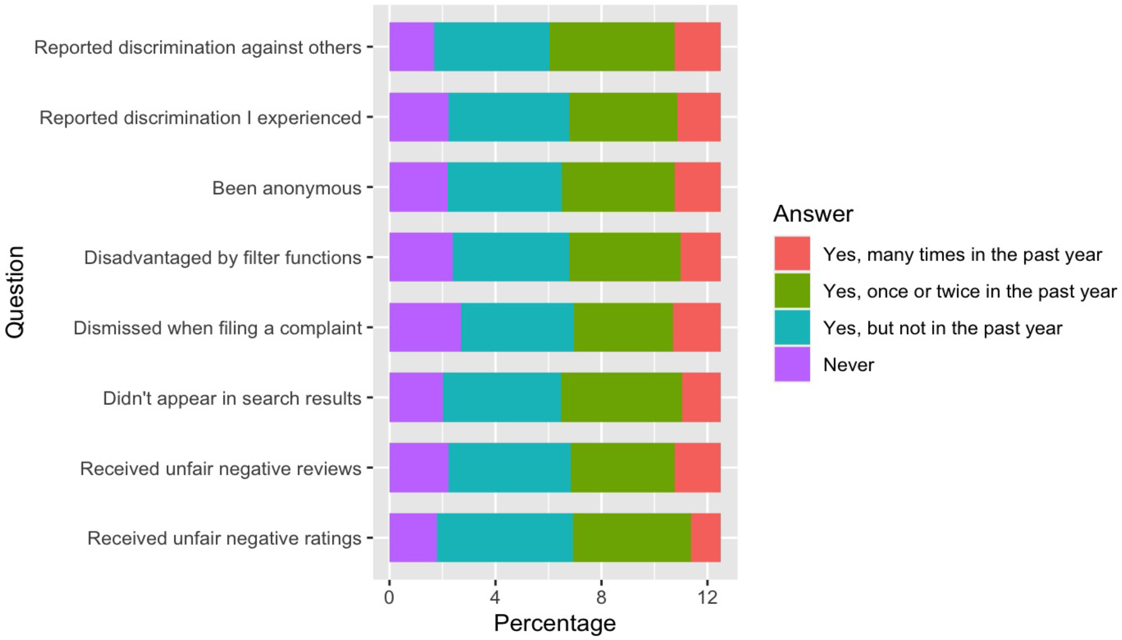 Distribution of specific experiences of platform discrimination from survey.