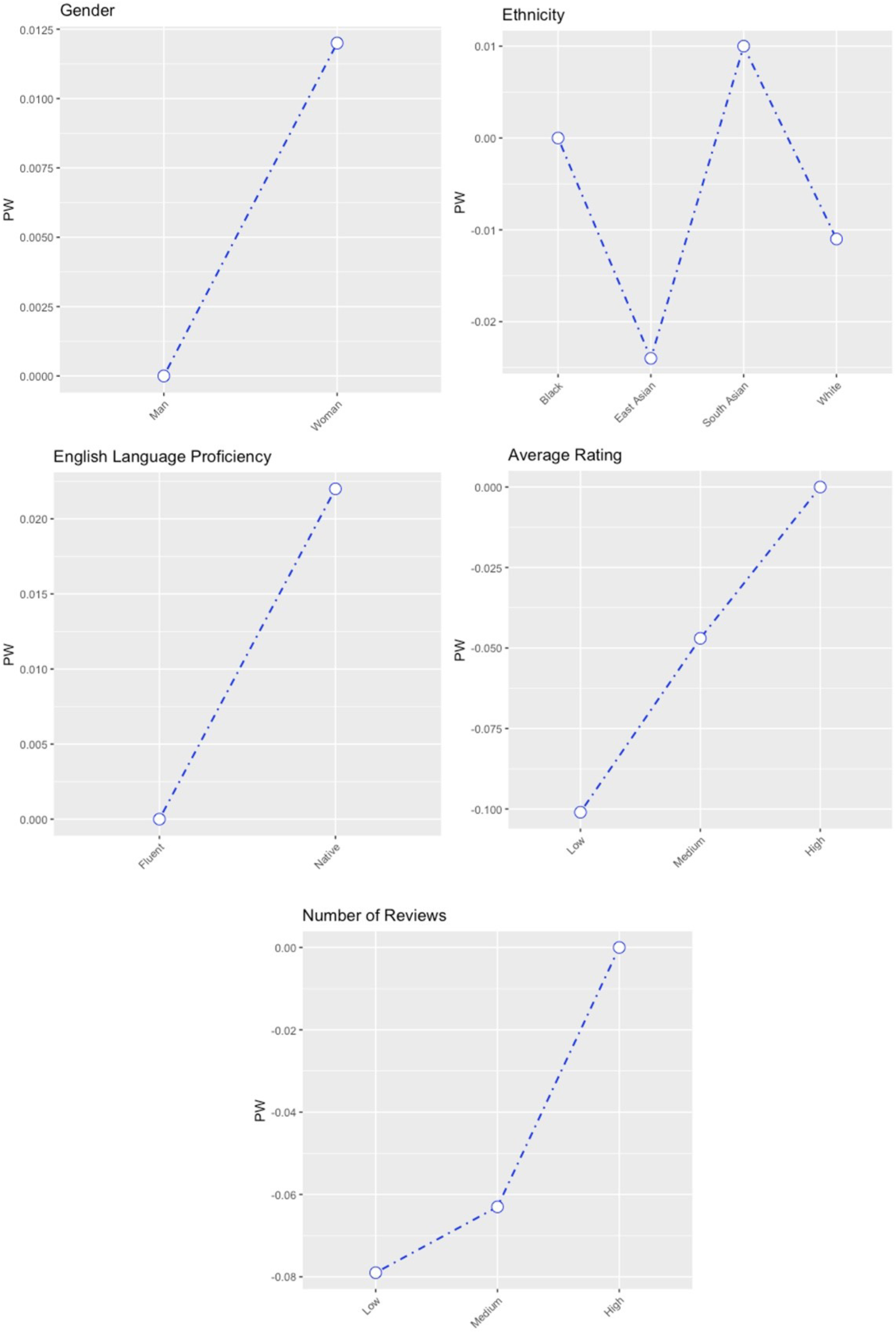 We sought to categorise intersectional hiring discrimination in OLMs, adding depth to RQ1. Using the HB method, we assessed the utility parameters for each hirer in the sample, as well as the entire sample. Table 7 shows the average part-worth utilities for each level of each attribute and the importance scores for each of the attributes. Part-worths explain the contribution of the levels of each attribute to the overall utility, allowing one to understand how changing specific characteristics of the freelancer affects hirers’ preferences for a particular hiring choice. Higher part-worth utility values indicate a greater preference for hiring a freelancer with that particular attribute. The part-worth utilities of each attribute are scaled to sum to 1, so they should be considered as relative values within the experimental setting. Figure 8 includes a non-scaled plot of the part-worths of each attribute.
