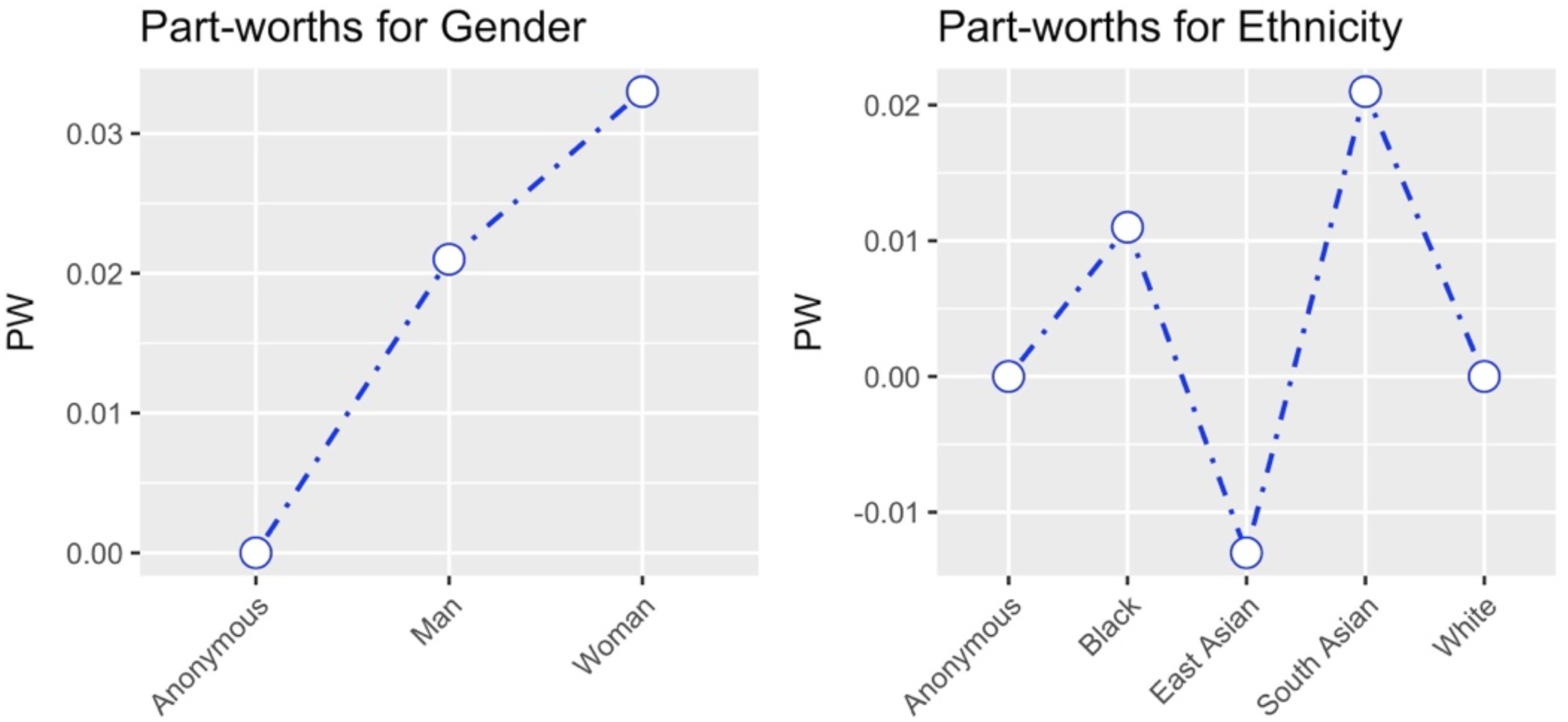 Baseline gender and ethnicity part-worths, including anonymity.