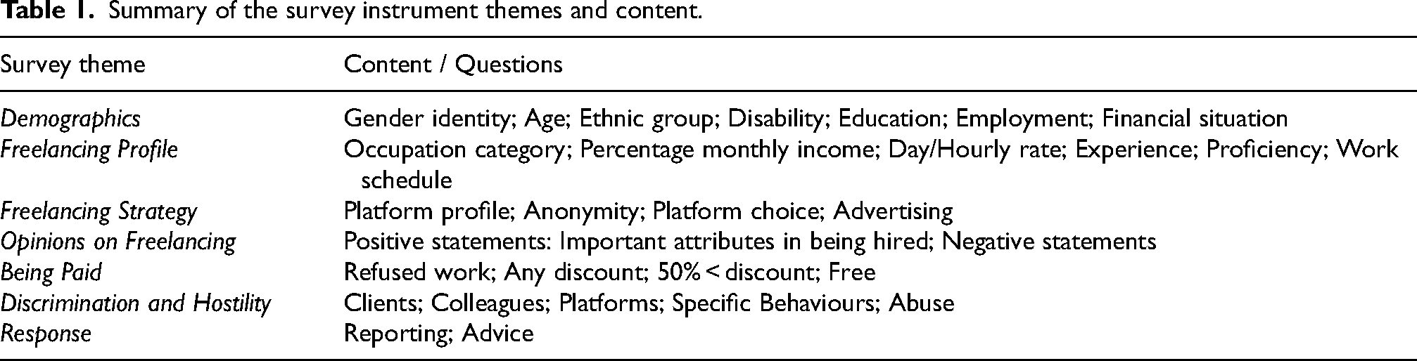 We developed a survey to collect freelancers’ experiences on how they experience discrimination. The survey was completed in July 2022 and yielded 884 valid responses. Respondents were reimbursed £7.50 for their time and to motivate detailed, free-text answers. We contacted freelancers by posting on social media forums for freelancers in the UK, specifically Facebook groups (i.e. Freelancers UK) and Reddit (r/freelanceuk). While non-probability sampling is often the gold standard in survey research, for comparison with existing research, we limited the sample to those who either lived in the UK or had British citizenship (Lehdonvirta et al., 2021). We focused on freelancers living in the UK to ensure internal validity as we are focusing on culturally shared notions of gender and ethnicity. However, the sampling frame does limit the generalisability of the findings outside of the UK. We determined that the sample characteristics were representative of the gender and ethnicity of the wider UK online freelancing population in terms of equivalent stratification identity categories. I 55% of the sample was women, 45% men, and <1% identified as non-binary or gender-queer. The mean age was 31 years. 93% of respondents disclosed their ethnicity; 53% were White, 30% identified as from Multiple Ethnic Groups, 6% were South Asian, and 4% were Black. There is likely an economic self-selection effect (Lehdonvirta et al., 2021), where the opportunity cost of participating in the survey is lower for lower-paid freelancers. A summary of the main themes of the survey is in Table 1.