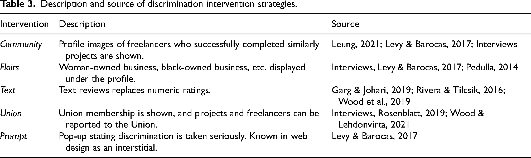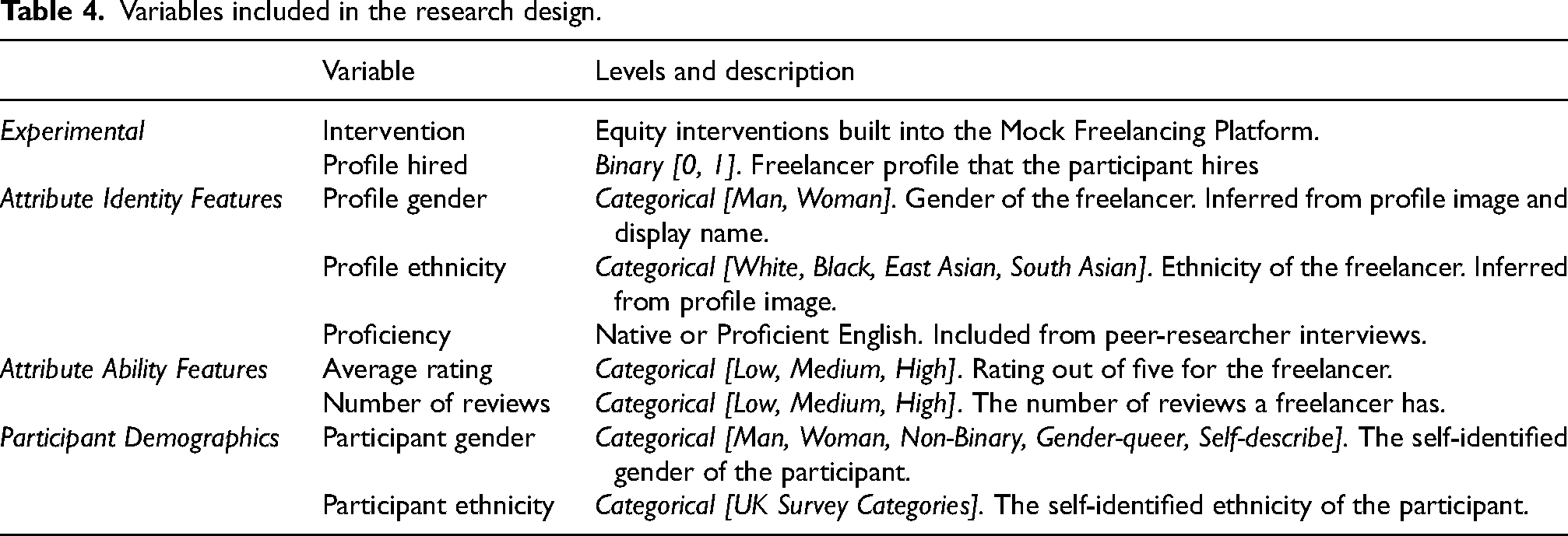 Twelve interviewees highlighted the importance of being a native English speaker for being hired. Freelancers shared that so-called ‘proficiency of English’, regardless of spoken ability, was used to justify refusing work or firing freelancers from a project. Freelancers referred to English proficiency as a ‘proxy’ for racism. Given the prominence of this theme in the interviews, we included English language proficiency as a variable of interest in the study. In addition, interviewees also proposed that membership in a freelancing union could challenge discrimination through a potential dispute resolution process where (a) the prices of labour were standardised to avoid undercutting, and (b) freelancers and clients could be reported to a union for discrimination and face sanctions on the platform. We thus included ‘union membership’ as one of our five design interventions. Table 3 outlines the design-based interventions that were selected for testing. We include a brief description of each intervention and the literature that the strategy was developed from. When a specific strategy was suggested by freelancers independently in interviews, this is noted in the source column with ‘interview’.