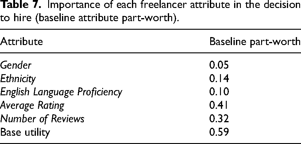 Table 7 shows that the average rating had the most significant influence on hirers’ preferences, with a relative importance of 41%. The number of reviews was the second most important attribute, responsible for 32% of the hiring decision. As expected, hirers preferred freelancers with the highest average rating and number of reviews. Notably, there is a greater difference between a medium and high number of reviews than between a medium and low number of reviews. There is thus a relative advantage for a high number of reviews compared to a medium than a medium number of reviews compared to low. Freelancer ethnicity (as a combined attribute) was reasonably salient, contributing 14% of the choice to hire. The preferred freelancer is South Asian. Hirers showed the least preference for freelancers who are East Asian. We find a preference for native English speakers over fluent speakers, which seems reasonable given the experiences freelancers cited in our interviews. Hirers in this study generally preferred women, and freelancer gender explained 5% of the overall hiring decision, as shown in Table 7. This supports previous research (i.e. Chan and Wang, 2018), which also suggest that in contrast to hiring in offline labour markets, hiring on OLMs favours women.