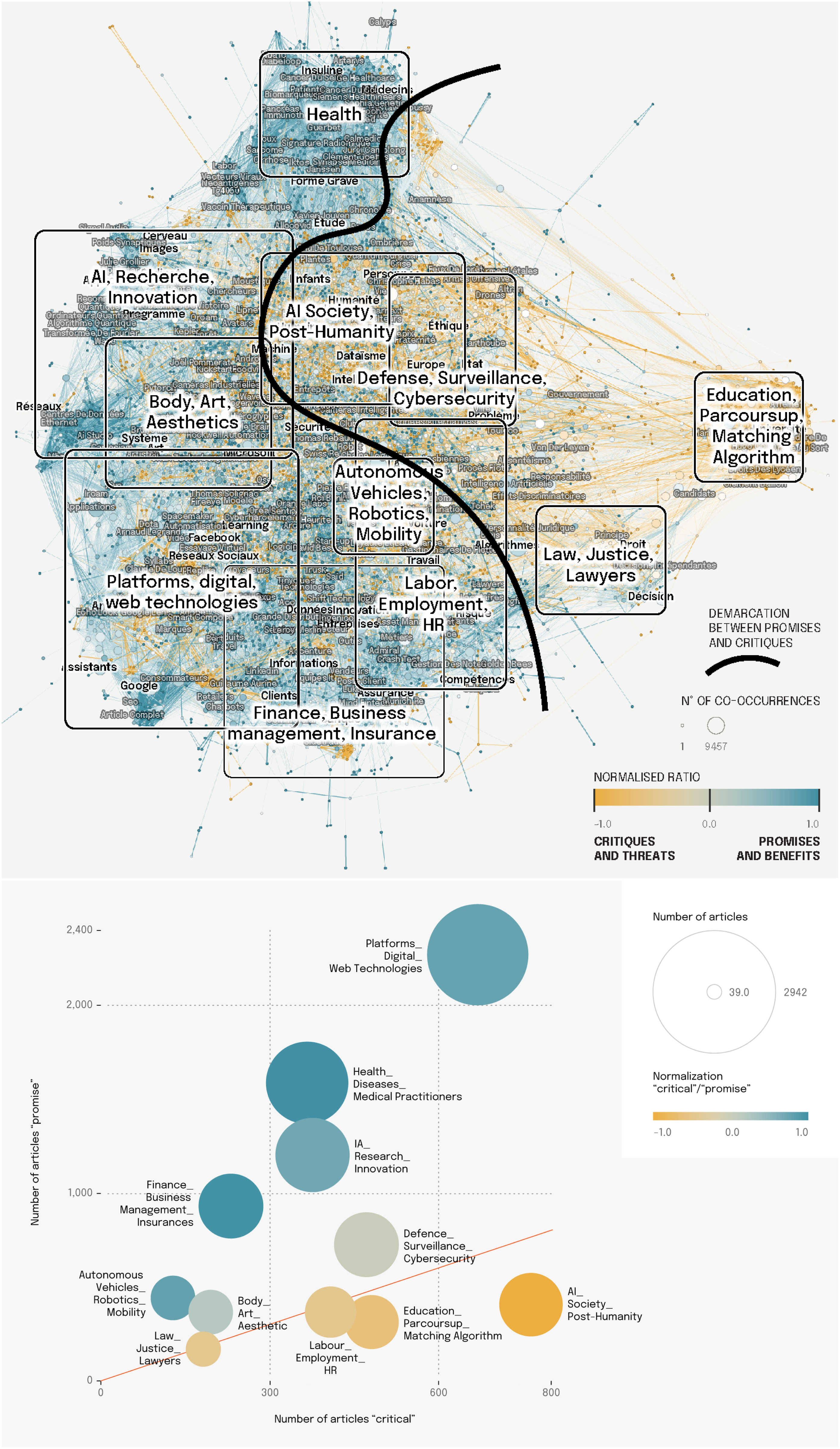In terms of tonality, each term of the network got a score projected onto the graph relative to its frequency in the ‘promises and benefits’ or ‘critiques and threats’ sub-corpus 7 (Figure 1). We observe a significant polarisation of our corpus: themes associated with critique mainly occupy the right side of the network, plus a few localised pockets in other parts of the graph. Critical themes are primarily related to education, justice, defence/security, but also to ethical issues regarding the development of AI in society. In contrast, themes on the left side of the network are more closely associated with promissory narratives, mainly related to AI R&D in general as well as in specific sectors, i.e., healthcare, art, research, commerce, and finance.