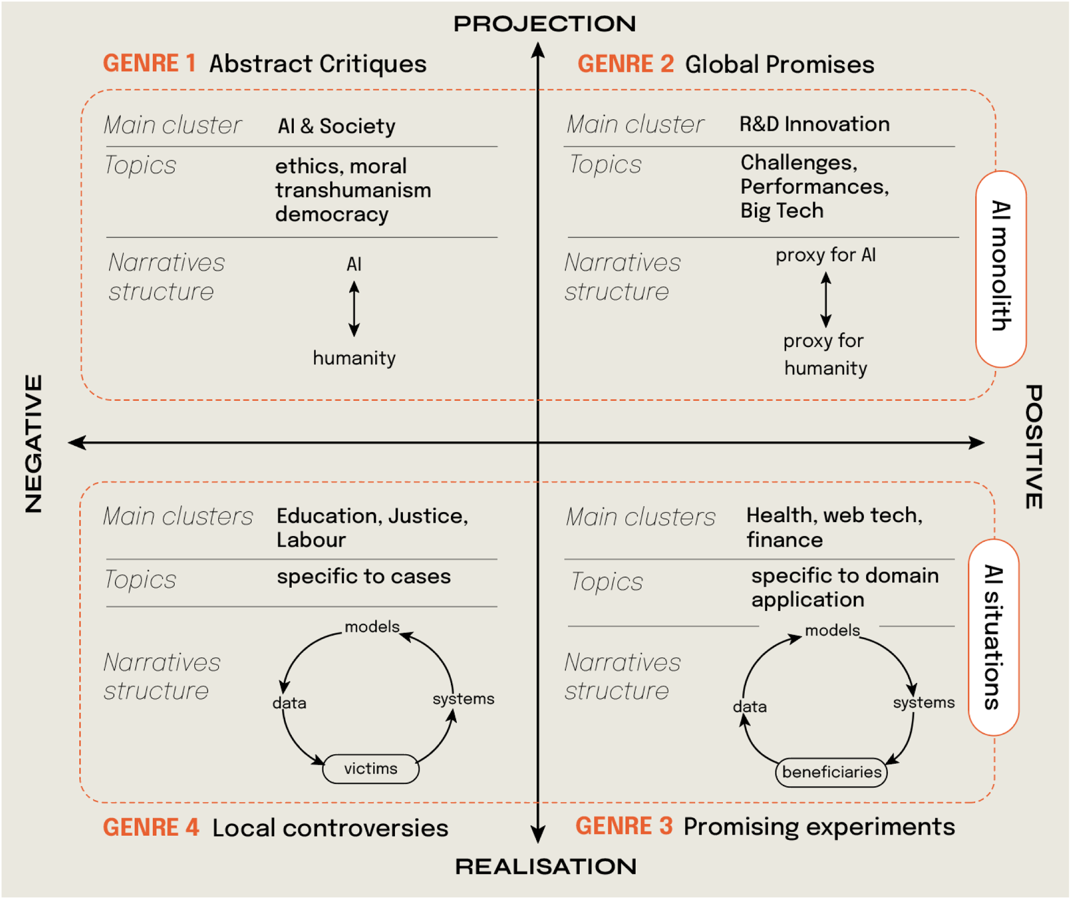 Although the clusters are not homogeneous in the way they account for AI, analysing the arrangements of the entities in each one revealed four typical narratives of AI, i.e. four genres. These four genres are organised on a two-axes matrix, from