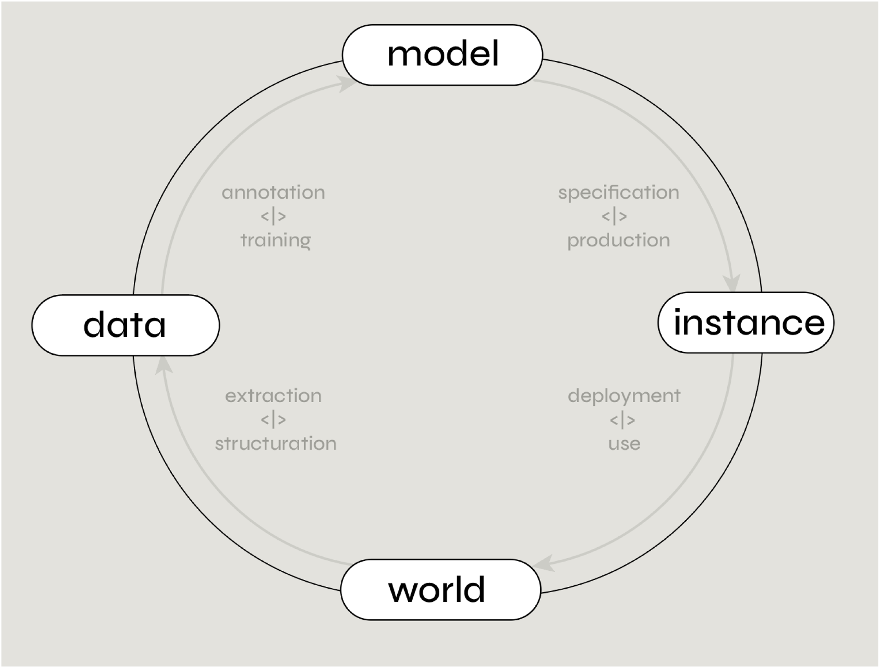 Given a broad definition of AI – a computational problem-solving method (model) that transforms diverse inputs (data) into optimal outputs (instances) ‘to achieve goals in the world’ (McCarthy, 2007), we chose to represent the diversity of data and computational practices that contribute to the continuous co-production process of the social and the technical as a loop (Figure 4).