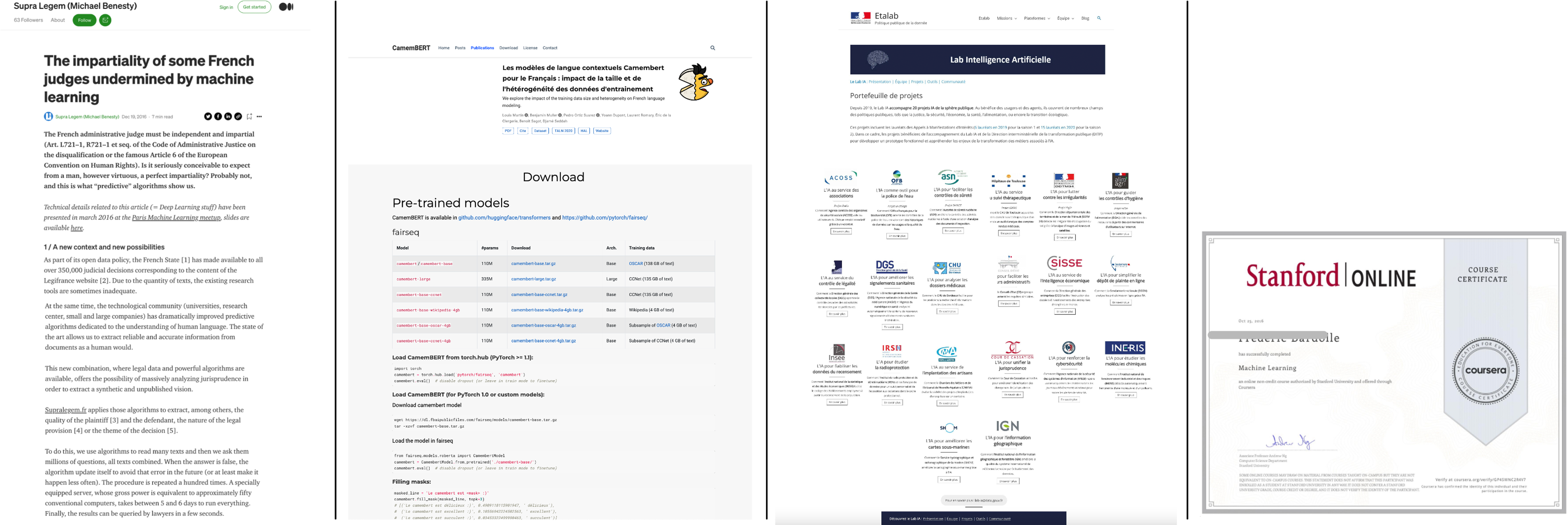 (a) ‘Blog post (Benesty (2016)) about judge impartiality. (b) Download section of CamemBERT website, a French language model, developed by INRIA and Facebook AI Research (Muller B , n.d.). (c) Portfolio of projects supported by the LabIA at Etalab (Portefeuille des projets - Etalab, 2001). (d) Personal certificate of an online course (MOOC) on Machine Learning proposed by Stanford University, taught by Andrew Ng. Source: personal documentation, date: 2016.