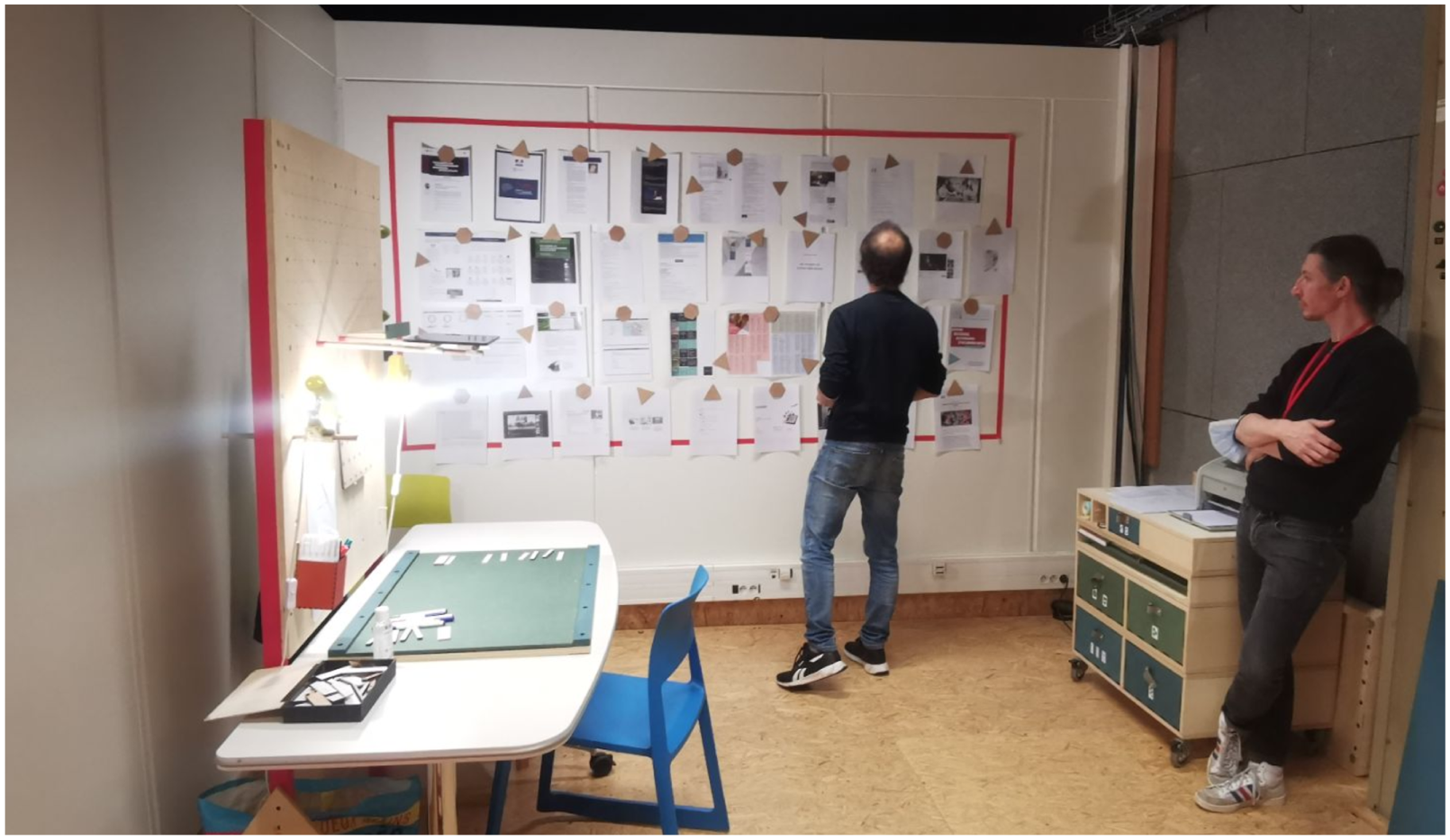 Setting of the second meeting at the Cité des Sciences et de l’Industrie, with the wall of documents and the working table.